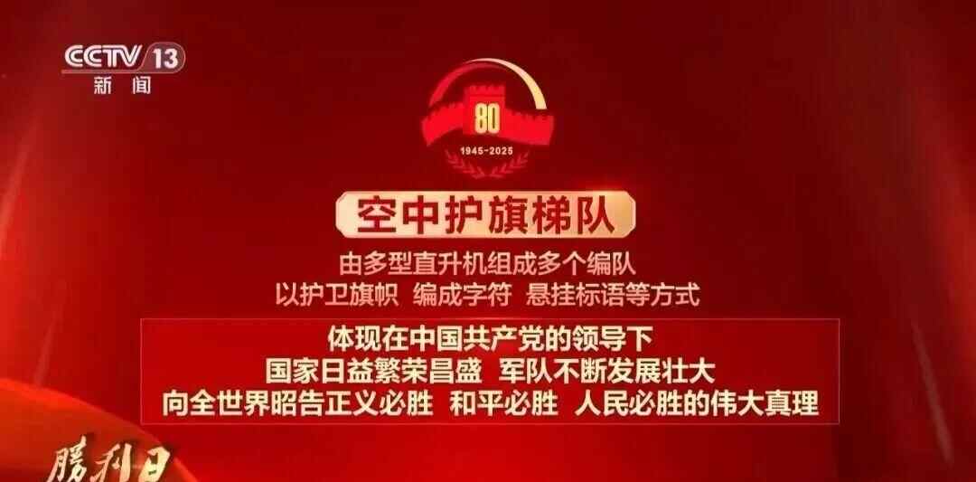 这次阅兵,编设45个方(梯)队。其中,空中护旗梯队,由多型直升机组成多个编队,以护卫旗帜、编成字符、悬挂标语等方式,体现在中国共产党的领导下,国家日益繁荣昌盛、军队不断发展壮大,向全世界昭告正义必胜、和平必胜、人民必胜的伟大真理。