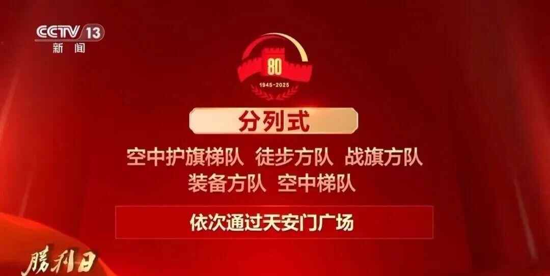 本次阅兵分列式中,将按照空中护旗梯队、徒步方队、战旗方队、装备方队、空中梯队的顺序,依次通过天安门广场。