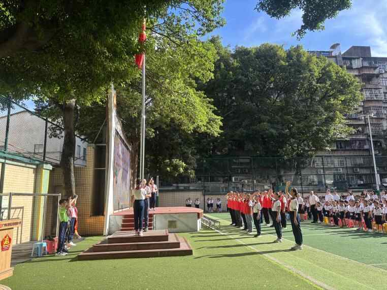 在随后的学校秋季学期开学典礼上,10名红棉老兵整齐排列,与6名学生代表共同举行升国旗仪式。国歌奏响,全校师生肃立致敬,鲜艳的五星红旗冉冉升起,红棉老兵们与少先队员共同行礼,为新学期拉开庄重序幕。
