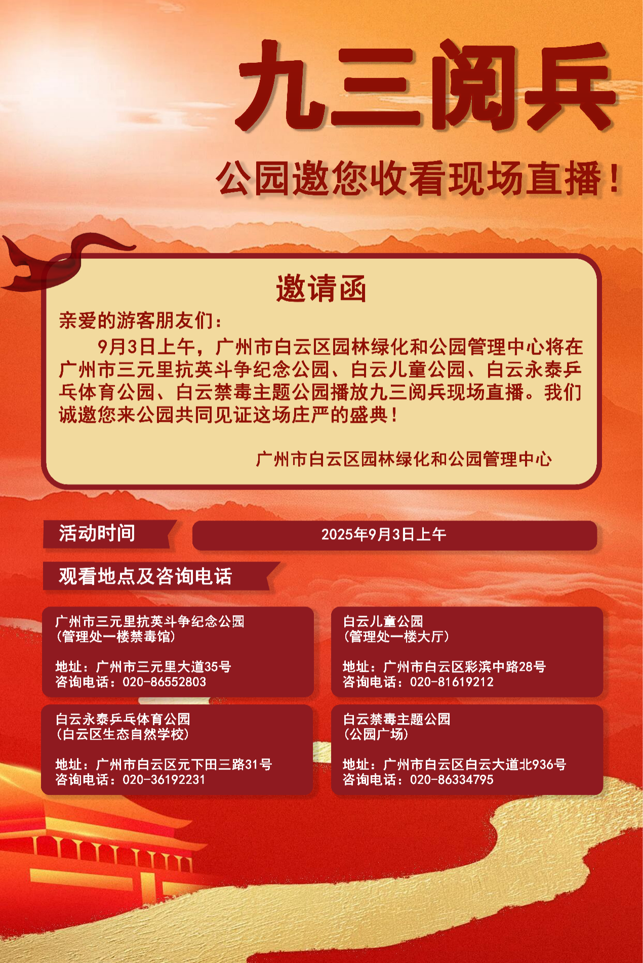 9月3日上午,纪念中国人民抗日战争暨世界反法西斯战争胜利80周年阅兵式将在北京隆重举行。记者获悉,当天上午,广州市白云区城管局绿管中心将在广州市三元里抗英斗争纪念公园、白云儿童公园、白云永泰乒乓体育公园、白云禁毒主题公园播放阅兵式现场直播。