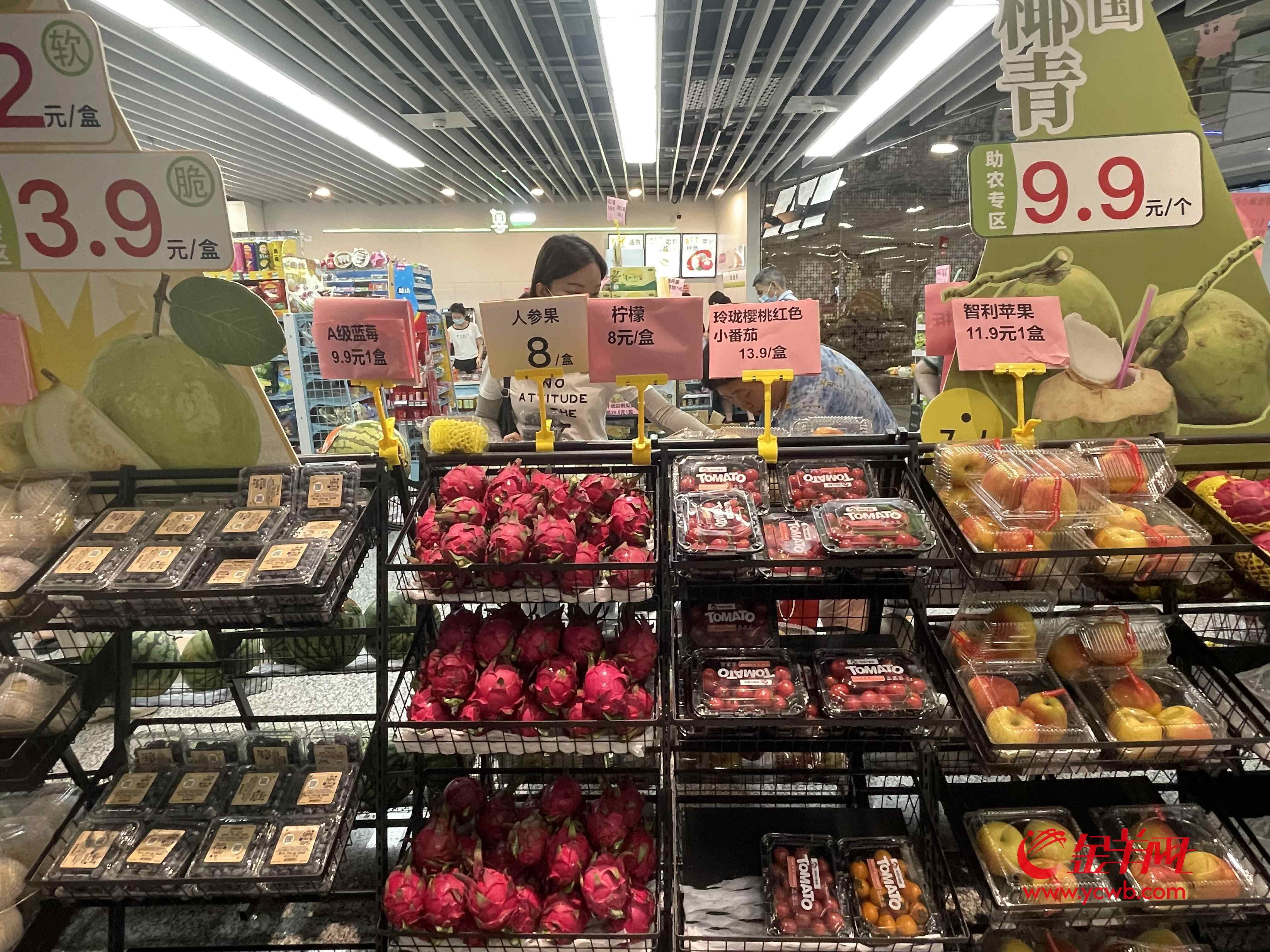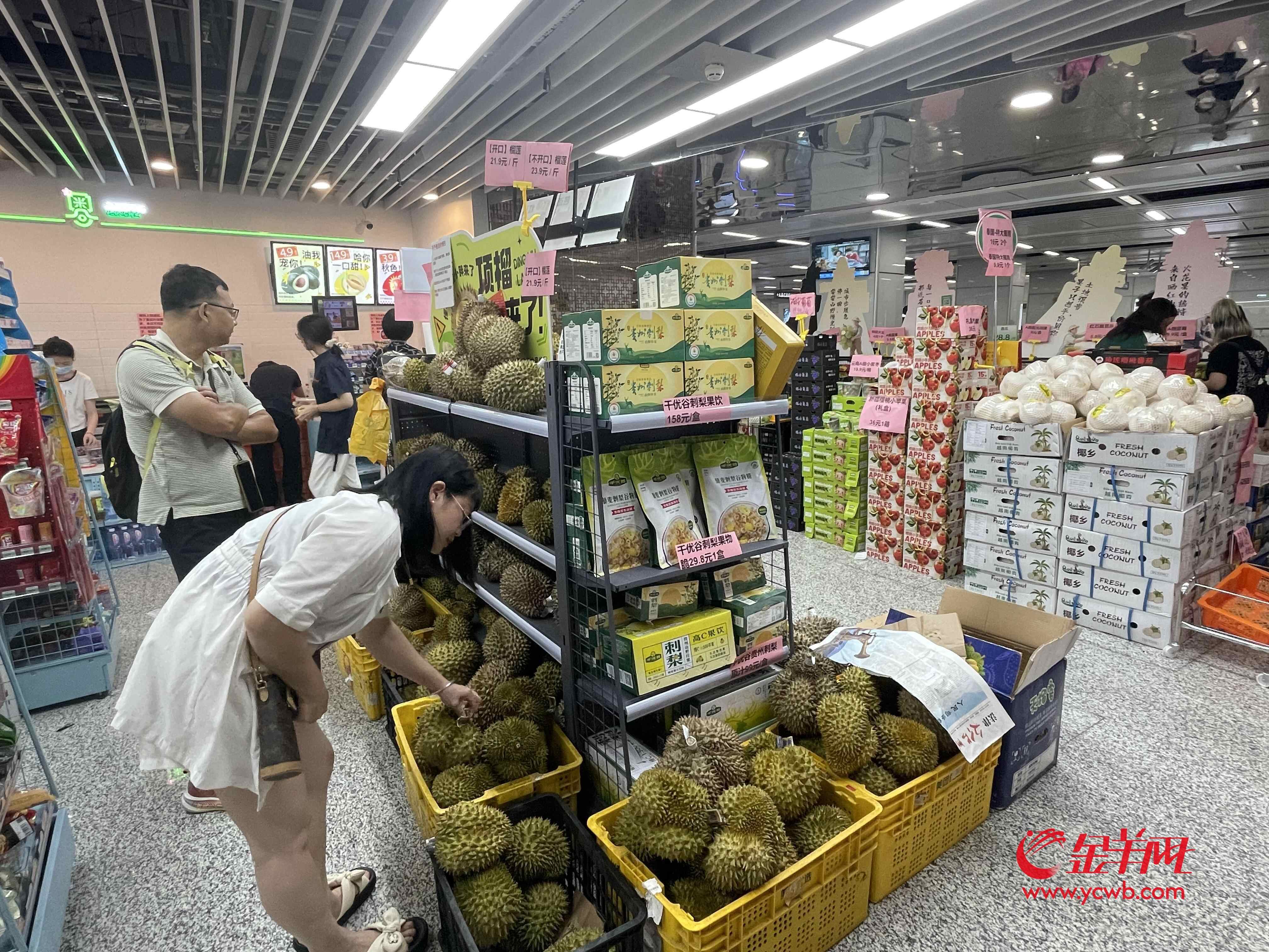1元一个红心火龙果、11.9元一盒的智利苹果、9.9元一斤的百香果……在“流动百千万·地铁优鲜购”超市内,乘客可以买到新鲜水果、零食、生鲜等,还有榴莲可供选购。“只要密封好,榴莲可以带上地铁。”店员表示。
