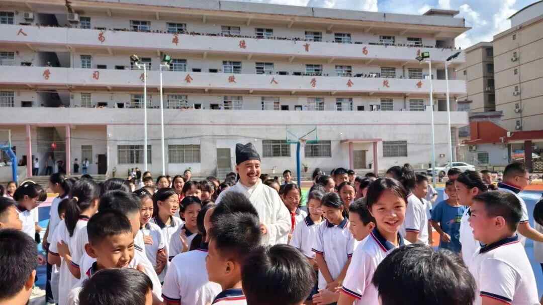 当天下午,全校师生共同参与了简单而正式的“诗歌校园揭幕礼”。同学们有序地站在走廊,目光汇聚于操场中央那幅缓缓拉开的幕布。学生和老师们携手揭幕,共同欢呼“翁小诗歌校园诞生啦!”。在小主持人的带领下,大家齐声朗读黄传钧的《春天分颜色》,清澈的童声汇聚在一起,飘荡在校园的空中。“翁城李白”也来到了现场,同学们欢呼着奔向“翁城李白”,和“翁城李白”一起在诗歌操场上背古诗。