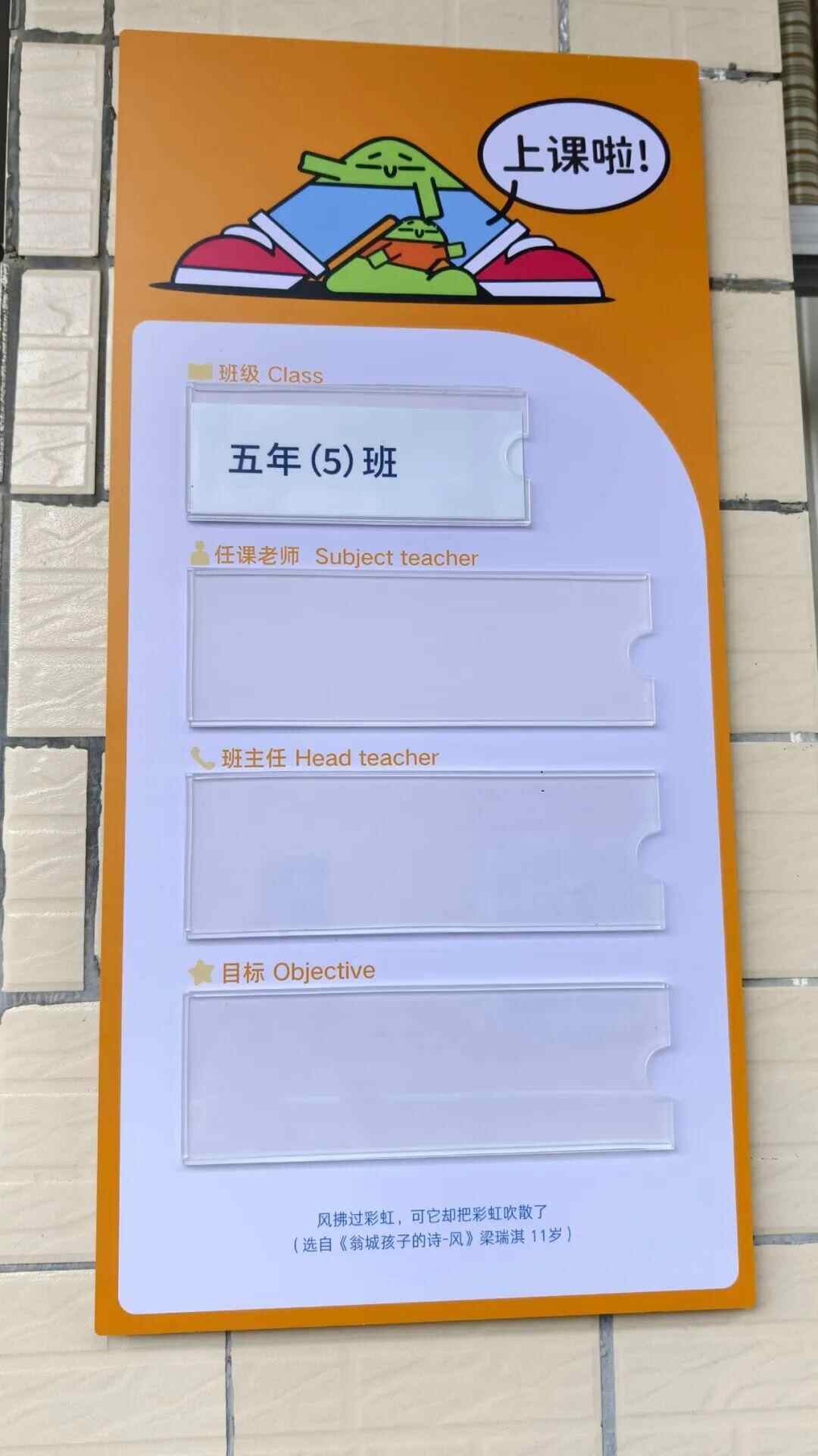 诗歌的气息并不止于操场。每一个班级门口,都挂上了独一无二的诗歌门牌;每天放学,孩子们举起的不再是普通的班牌,而是一面面印着“诗歌宝宝”和翁城小诗人句子的小旗帜。就连图书室、美术室、大礼堂等空间,也在悄然变身为诗的窗口。
