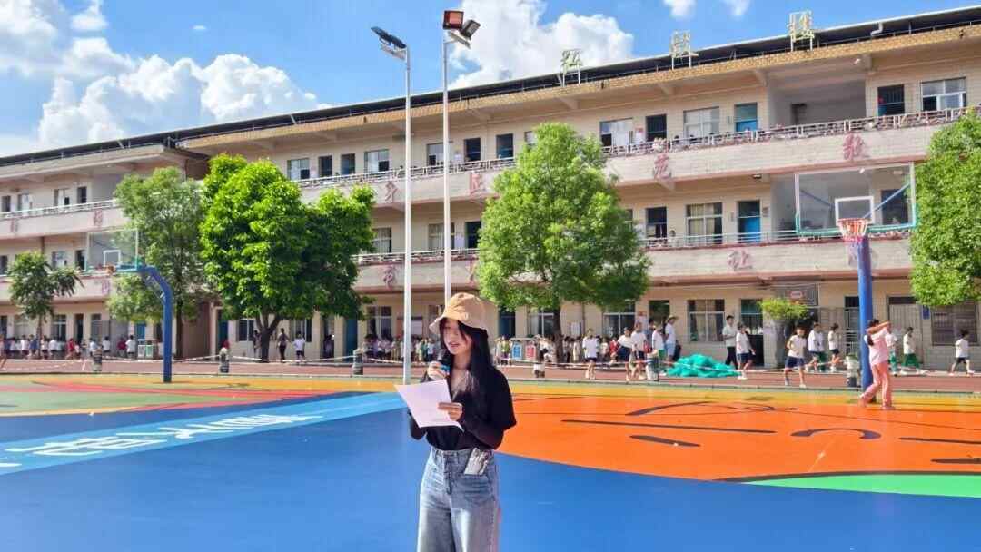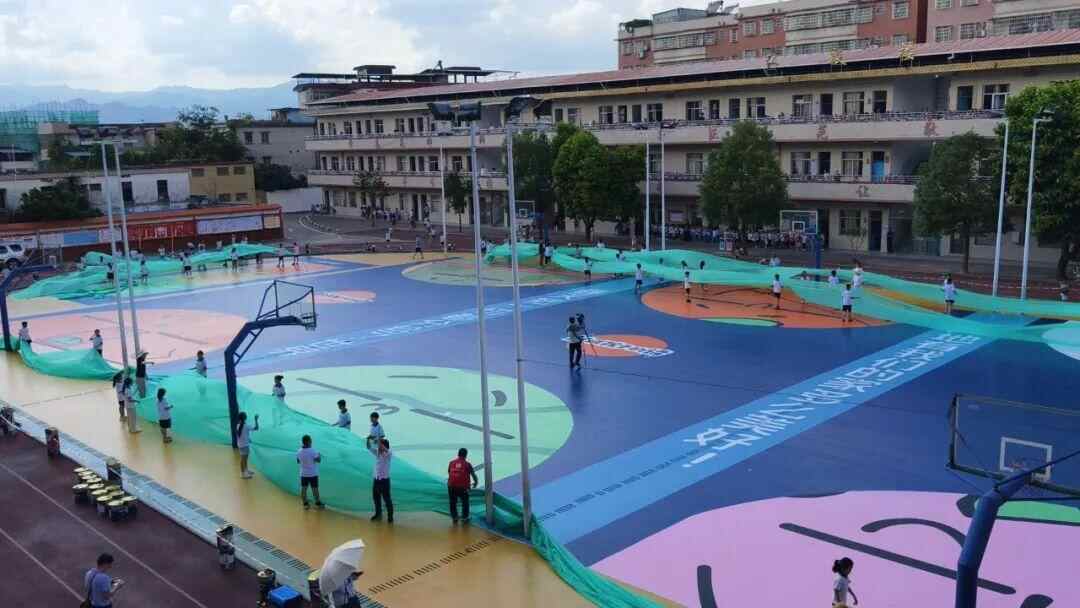 最吸引眼球的,是那座焕然一新的操场。篮球场与羽毛球场地面跃动着八个活泼可爱的“诗歌宝宝”图案,它们仿佛正从诗歌中跳出来,邀请孩子们一起游戏。而更动人的,是印在地面的两句诗——一句来自黄传钧《春天分颜色》:“春天把一切都分给了世界”,另一句出自龙丽娜《大地》:“大地有我们的家,多么美好!”