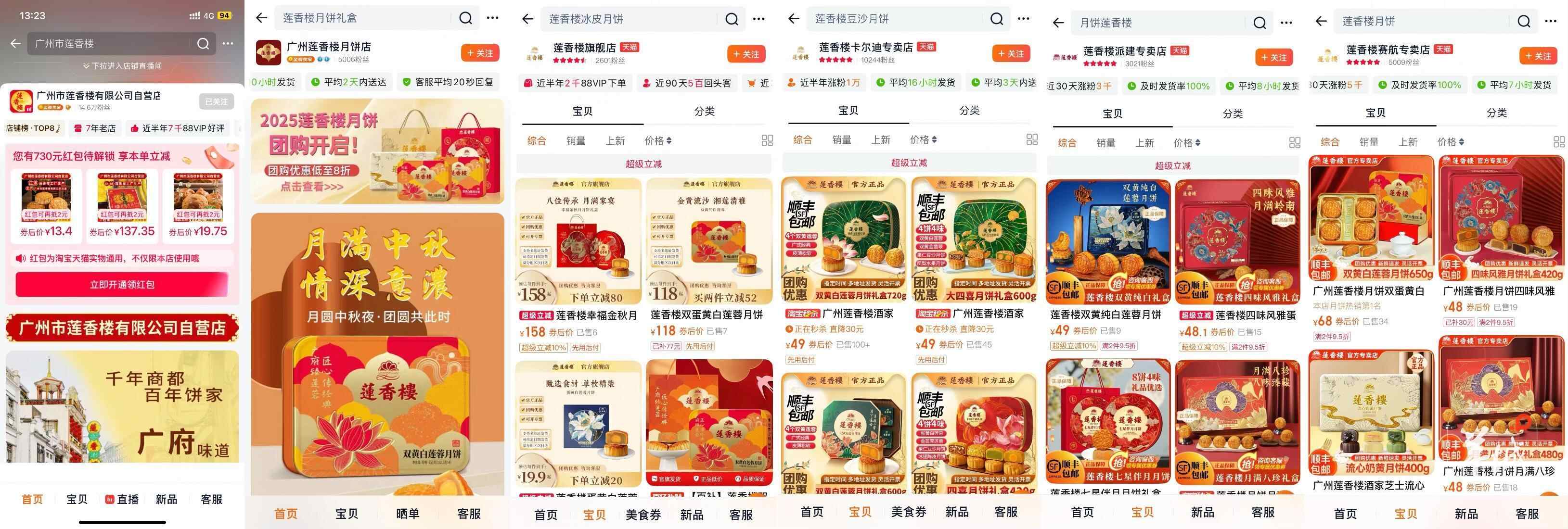 如在淘宝,输入“莲香楼”,能发现有:“莲香楼旗舰店”,注册企业为广州老字号投资控股有限公司;“广州市莲香楼有限公司自营店”,注册企业为广州市莲香楼有限公司;“广州莲香楼月饼店”,注册企业为广州楷谦贸易有限公司;“莲香楼卡尔迪专卖店”,注册企业为广州卡尔迪国际商贸有限公司;“莲香楼派建专卖店”,注册企业为广州派建贸易有限公司;“莲香楼赛航专卖店”,注册企业为广州赛航贸易有限公司……
