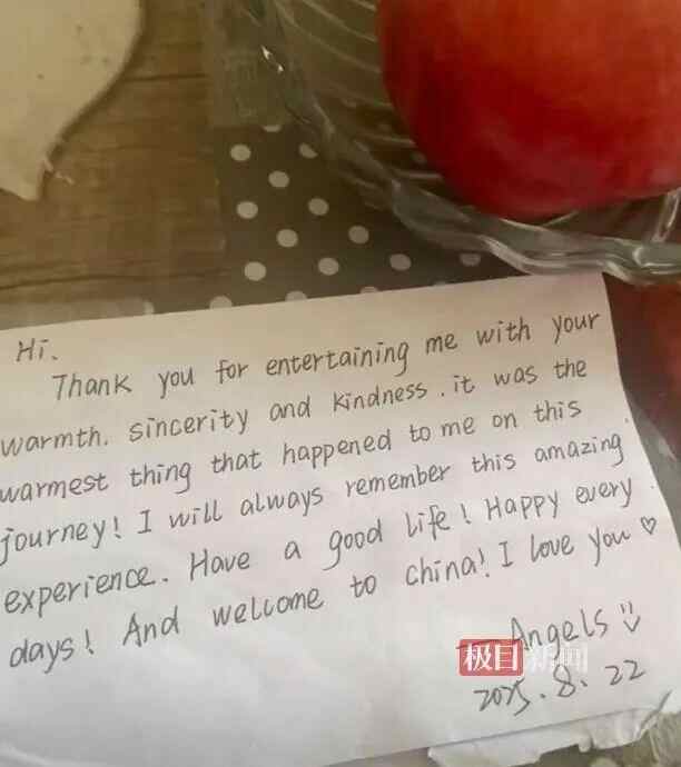 还有一天在阿联酋,她没找到住的地方,一位巴基斯坦大叔发现她独自在路边,大叔得知她来自中国还没找到住的地方,表示中国给予巴基斯坦很多帮助,他特别喜欢中国,两国人民是朋友。大叔说话举止特别绅士,把她带回宿舍安顿还给她做了一顿饭。她离开的时候想感谢大叔,但自己也没有什么拿得出手的礼物,于是手写了一份感谢信。