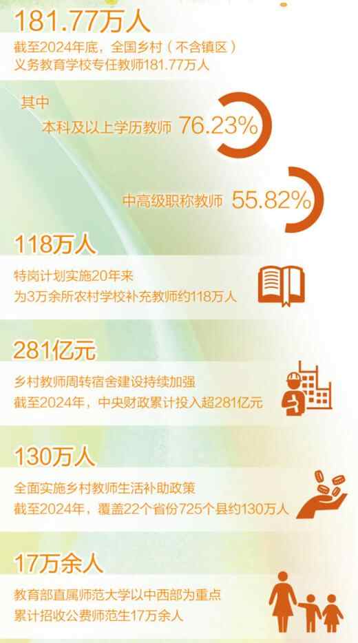 这是真金白银的投入。2024年,特岗教师工资性补助再次提标,每人每年增加3600元;乡村教师生活补助政策深入实施,受益教师约130万人,人均月补助金额约400元;乡村教师周转宿舍建设持续加强,中央财政累计投入超281亿元,建设约63.7万套。