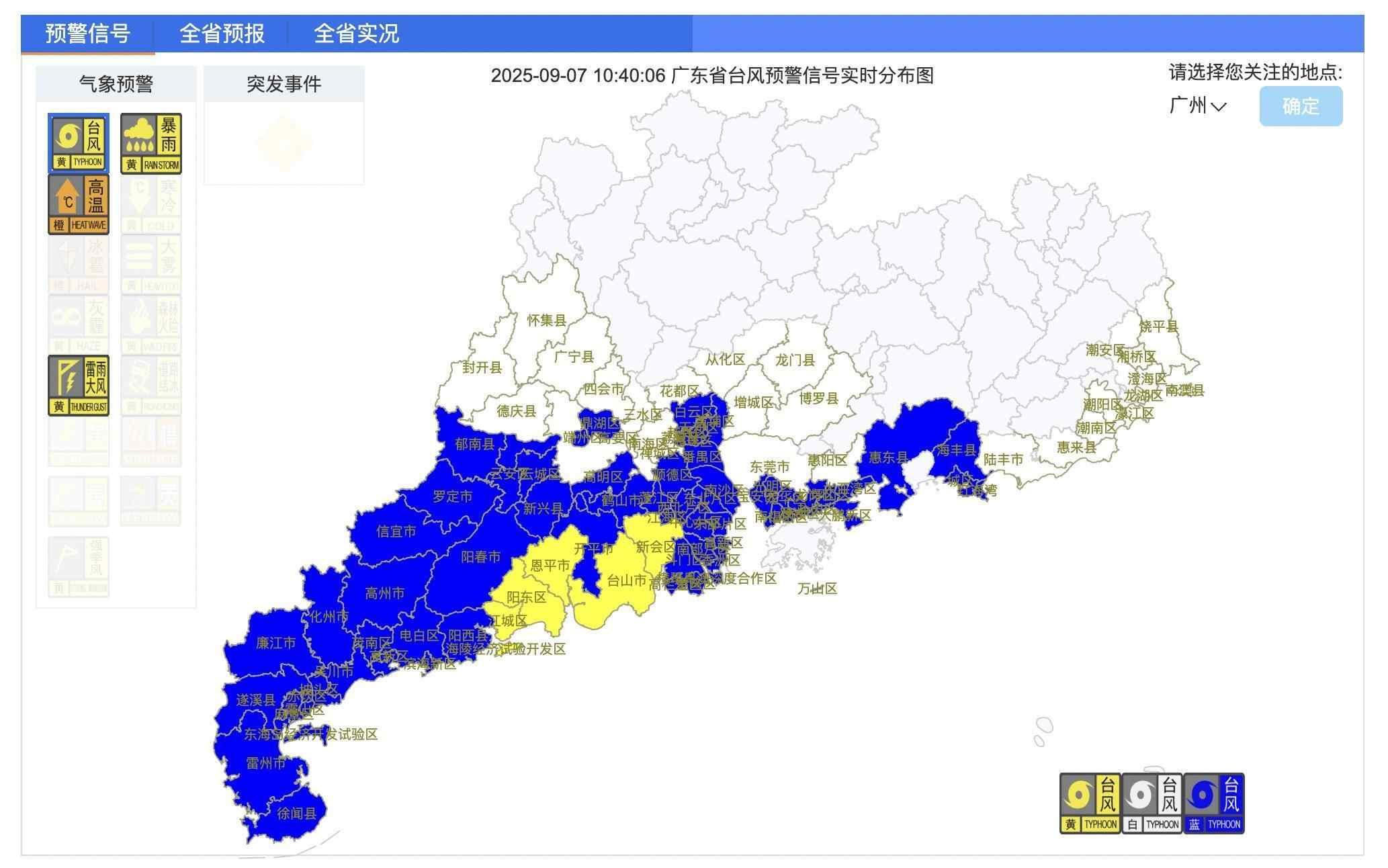 受“塔巴”持续移近影响,广东中西部沿海地区,已在9月7日10时前后,陆续将台风预警信号由蓝色升级为黄色。截至10时40分,江门新会、台山、恩平,阳江江城、阳东、海陵经济试验开发区等地,已经发布台风黄色预警信号。由于预计“塔巴”仍向广东中西部沿海靠近,不排除广东各地后续继续发布或升级台风预警信号的可能。