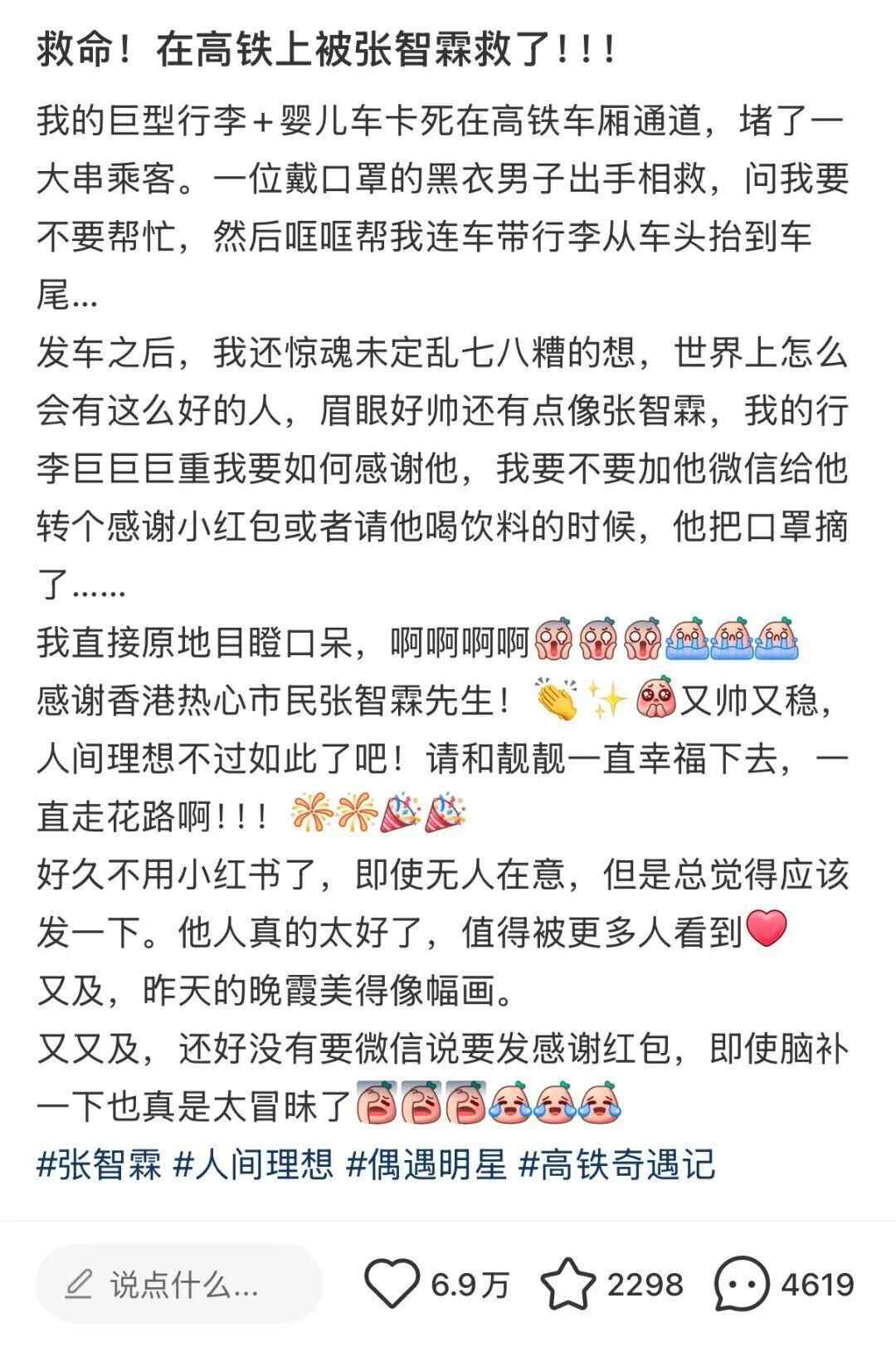 9月7日凌晨,网友“一颗小芝麻”在社交平台发文感谢“香港热心市民张智霖先生”。网友表示,高铁上自己的行李和婴儿车卡死在高铁车厢通道,堵了一大串乘客。一位戴口罩的黑衣男子出手相救,连车带行李从车头抬到车尾,网友准备加微信表示感谢时,发现对方原来是张智霖。