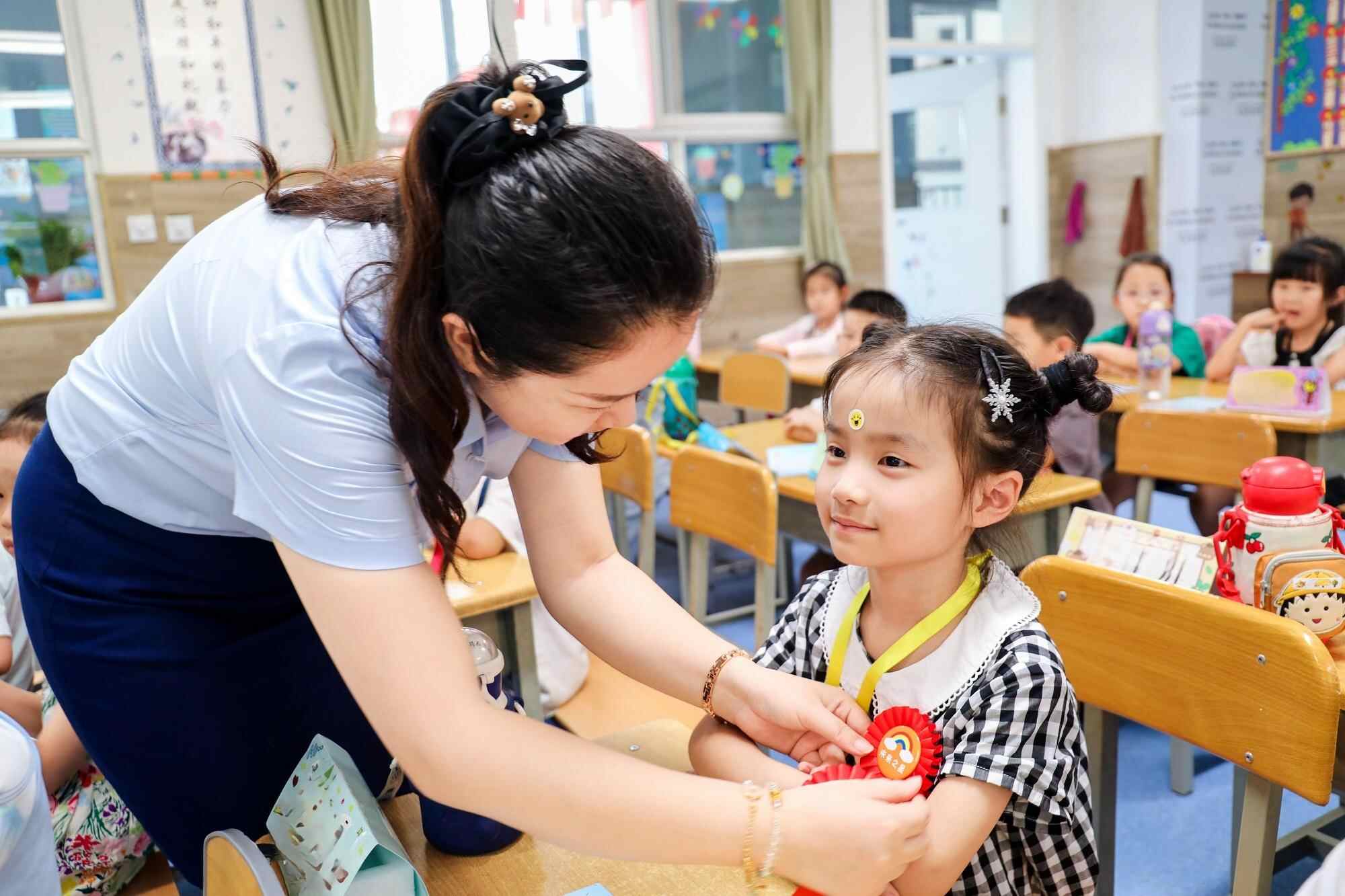 老师为新生带上奖励的“小勋章”(央广网发 西安高新第八小学供图)