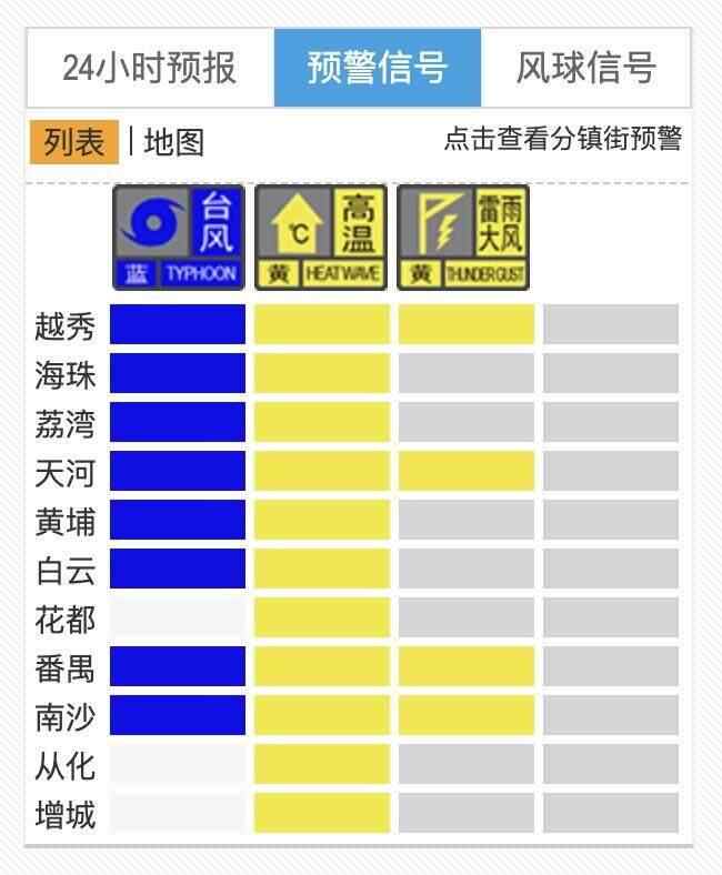 截至9月7日14时21分,广州多区同时发布台风、雷雨大风、高温预警信号。其中越秀、天河、番禺、南沙发布雷雨大风黄色预警信号;越秀、海珠、荔湾、天河、黄埔、白云、番禺、南沙发布台风蓝色预警信号,其他区发布台风白色预警信号;全市所有区均维持发布高温黄色预警信号。