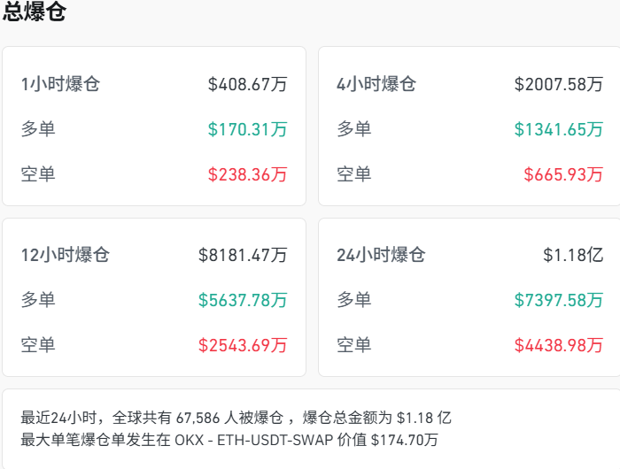 Coinglass数据显示,过去24小时加密货币市场共有6.7万人被爆仓,爆仓总金额为1.18亿美元。
