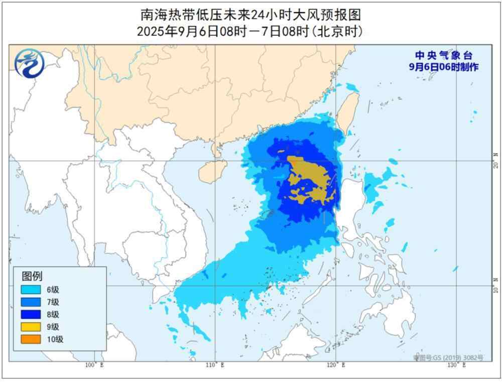 中央气象台预计, 9月6日8时至7日8时,南海大部、巴士海峡、台湾海峡南部、珠江口区、广东中东部沿海将有6-8级大风,其中南海东部部分海域风力可达9-10级,阵风11-12级。