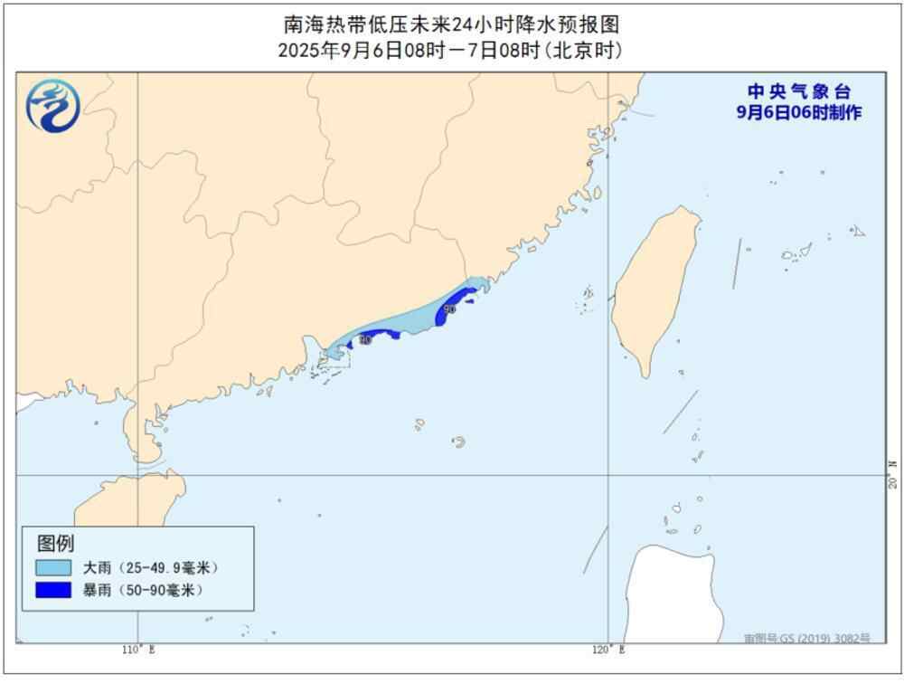 预计9月6日8时至7日8时,广东东部沿海将有大到暴雨(50-90毫米)。