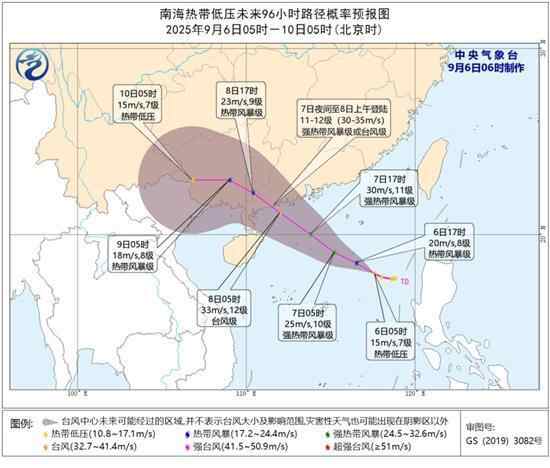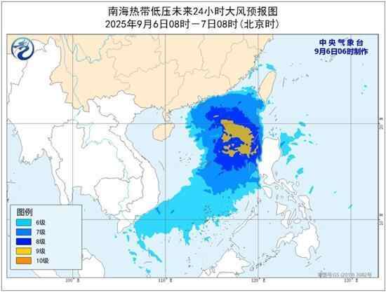 大风预报:9月6日08时至7日08时,南海大部、巴士海峡、台湾海峡南部、珠江口区、广东中东部沿海将有6—8级大风,其中南海东部部分海域风力可达9—10级,阵风11—12级。