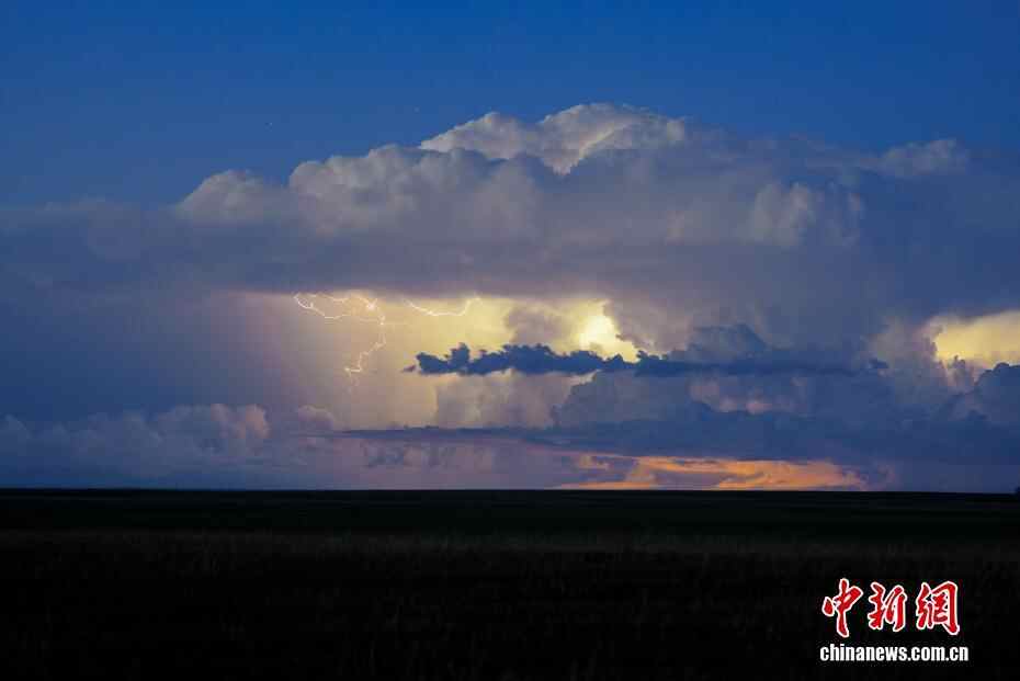 近日,内蒙古自治区呼伦贝尔市新巴尔虎右旗草原及呼伦湖西岸上空,出现一场极具视觉震撼力的雷暴云自然奇观。摄影爱好者采用延时摄影形式,完整记录下这一难得的自然景象。闪电划破厚重的云层,时隐时现,与夜空中闪烁的繁星相互辉映。图为闪电将天空染成渐变色。