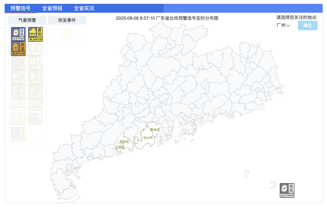 伴随着该热带低压继续移近,广东沿海地区在9月6日早晨陆续发布台风预警信号。截至6日8时57分,江门新会区、台山市,阳江江城区、阳东区等地,已经发布台风白色预警信号。
