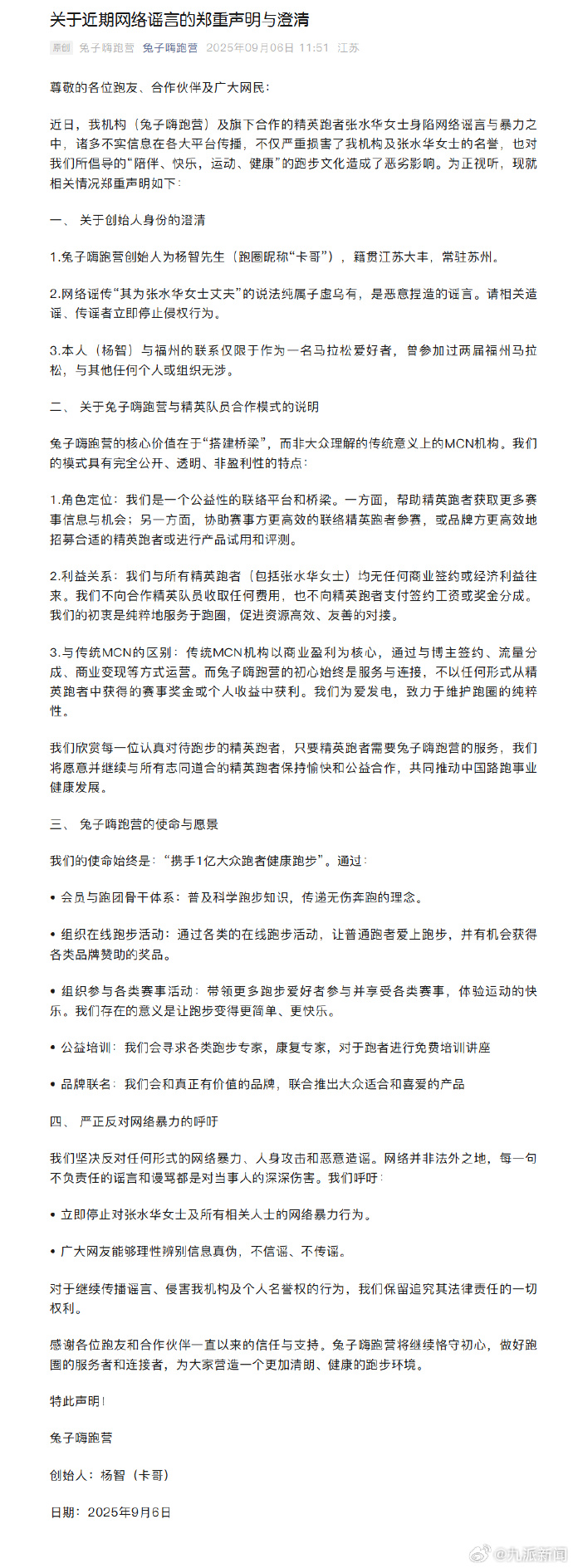 9月6日,张水华所属MCN兔子嗨跑营发布“关于近期网络谣言的郑重声明与澄清”,称网络谣传嗨跑营创始人杨智先生是张水华女士丈夫的说法纯属子虚乌有,是恶意捏造的谣言。杨智与福州的联系仅限于作为一名马拉松爱好者,曾参加过两届福州马拉松,与其他任何个人或组织无涉。兔子嗨跑营的核心价值在于“搭建桥梁”,而非大众理解的传统意义上的MCN机构。其模式具有完全公开、透明、非盈利性的特点。