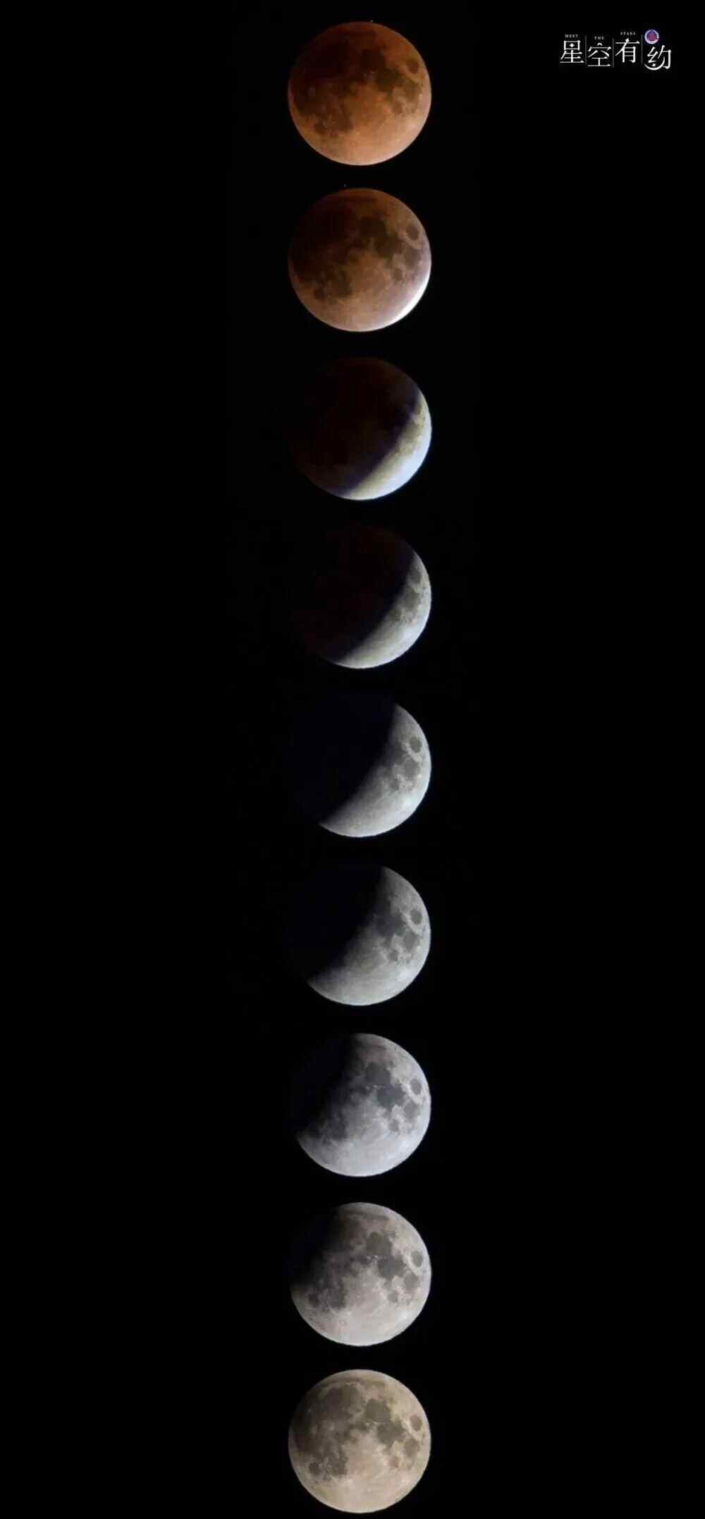 这次月全食始于北京时间9月7日23时28分,此时月球开始稍微阴暗(半影食始);8日零时27分,月面开始有缺(初亏);1时31分,月球完全进入地球本影(食既);2时12分,月球的中心与地球本影的中心最近(食甚);2时53分,月球开始重现光芒(生光);3时56分,月球走出地球本影(复圆);4时55分,月食现象结束(半影食终)。其中,食既到生光为全食阶段,也就是民间俗称的“红月亮”,持续1小时22分。