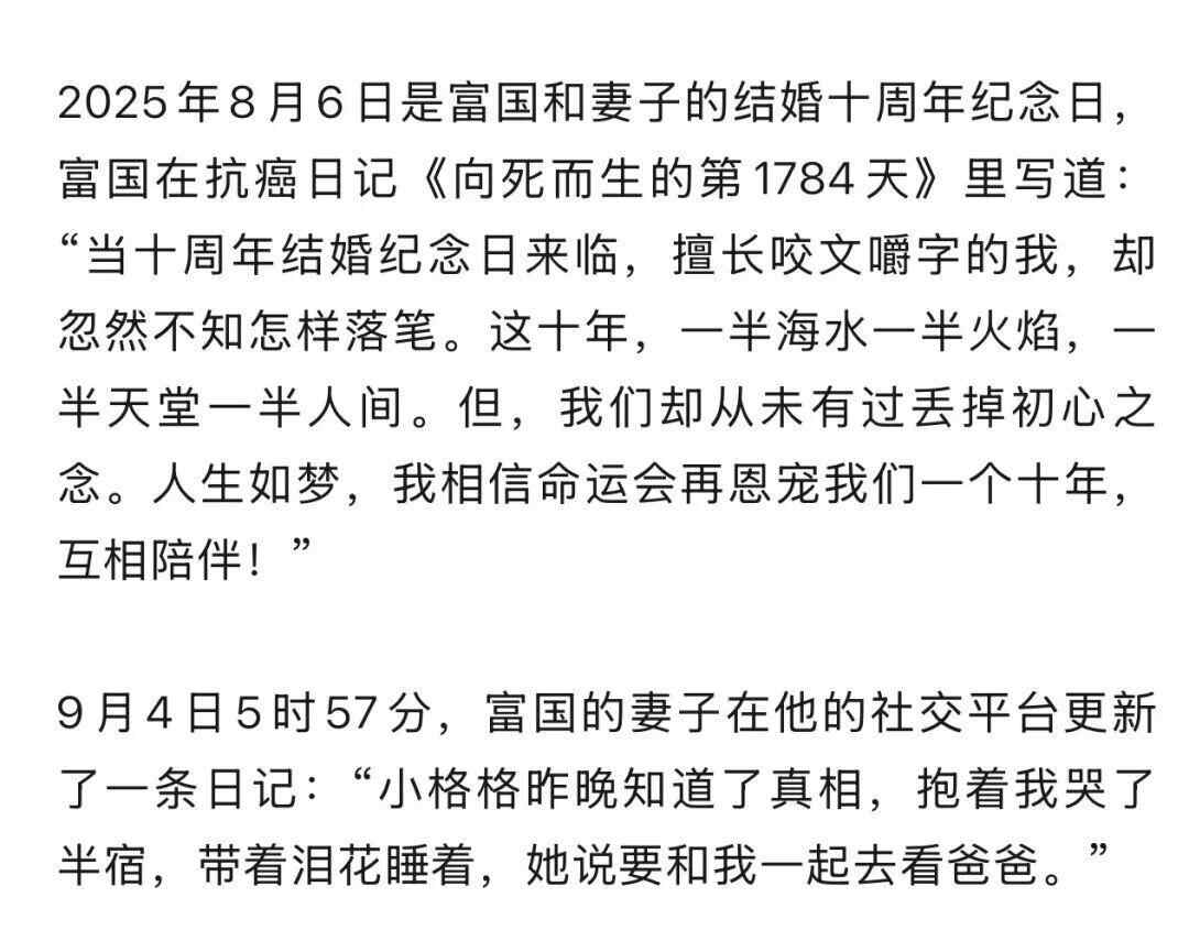 9月2日,富国的家属发布讣告:我们怀着无比沉痛的心情通告,富国先生于2025年9月2日上午10时,在北京清华长庚医院安宁病房不幸与世长辞,享年42岁。