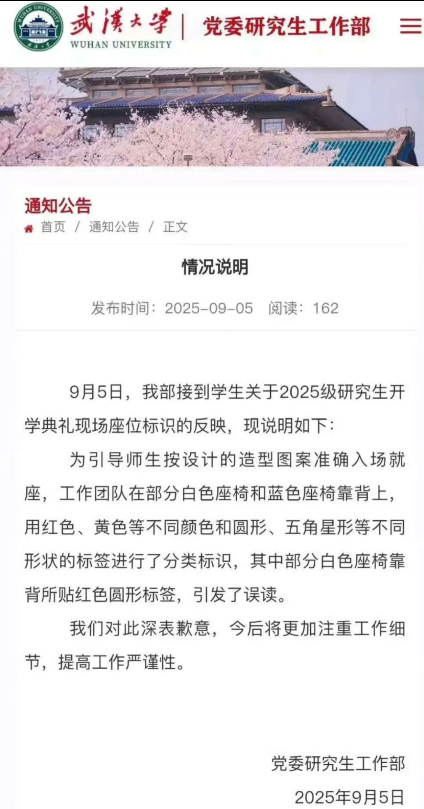 近日,武汉大学开学典礼部分白色座椅靠背粘贴红色圆形标签引发争议。对此,武汉大学党委研究生工作部发布情况说明:为引导师生按设计的造型图案准确入场就座,工作团队在部分白色座椅和蓝色座椅靠背上,用红色、黄色等不同颜色和圆形、五角星形等不同形状的标签进行了分类标识,其中部分白色座椅靠背所贴红色圆形标签,引发了误读。我们对此深表歉意,今后将更加注重工作细节,提高工作严谨性。