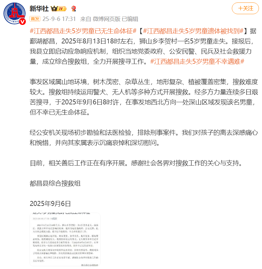 9月6日,江西都昌县综合搜救组发布消息:2025年8月13日18时左右,狮山乡李贺村一名5岁男童走失。接报后,我县立即启动应急响应机制,组织当地党委政府、公安民警、民兵及社会救援力量,成立综合搜救组,全力开展搜寻工作。