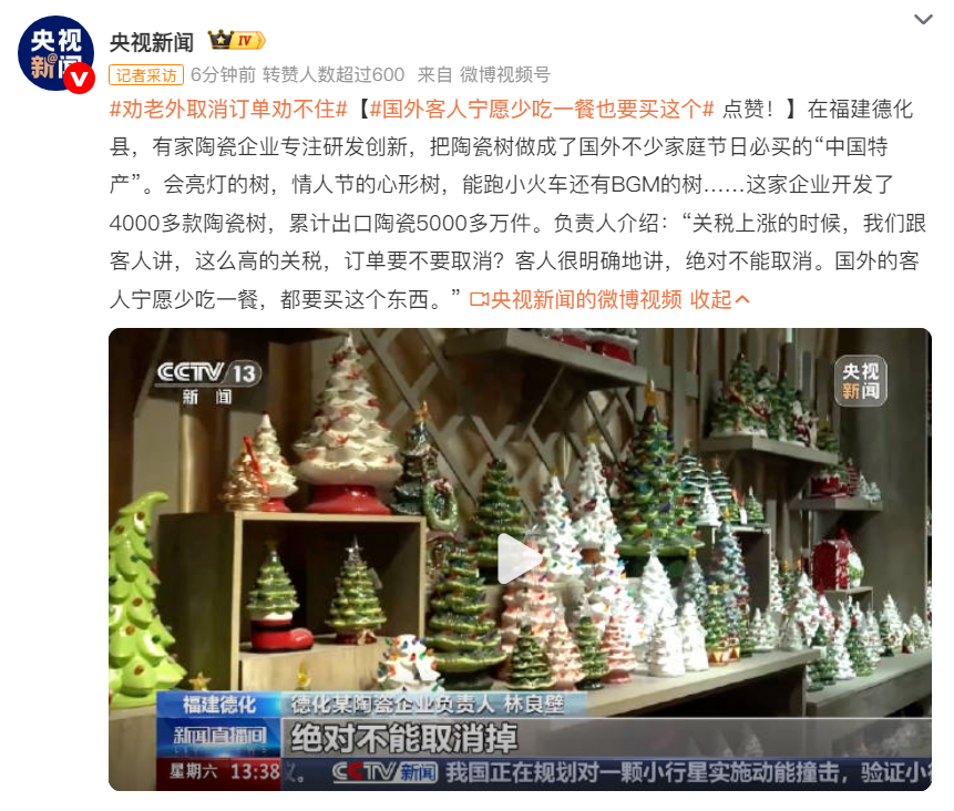 在福建德化县,有家陶瓷企业专注研发创新,把陶瓷树做成了国外不少家庭节日必买的“中国特产”。会亮灯的树,情人节的心形树,能跑小火车还有BGM的树……这家企业开发了4000多款陶瓷树,累计出口陶瓷5000多万件。