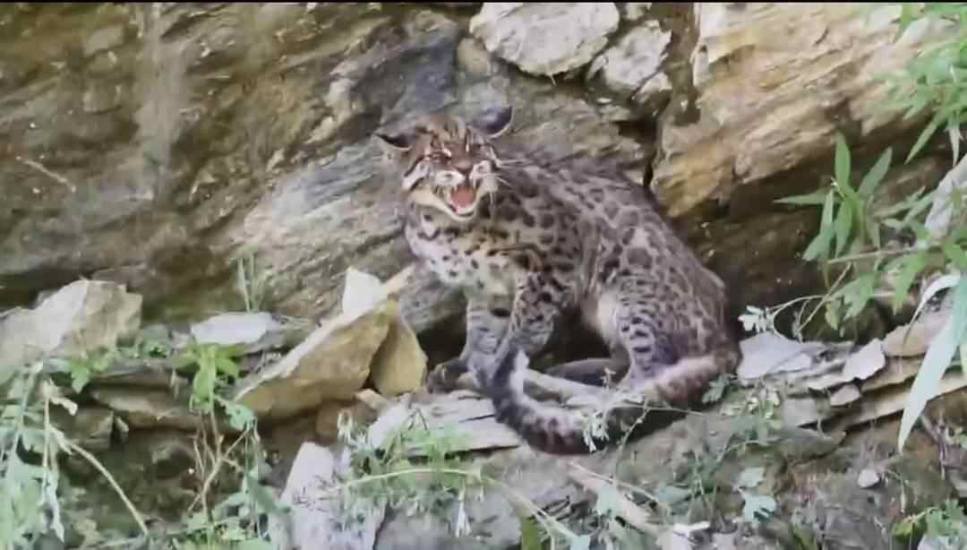 邹文斌用手机拍下亚洲金猫的活动画面,视频画面显示,这只蹲坐在岩石旁的亚洲金猫警惕地张大嘴巴露出尖牙,时而抬头张望,时而低头嗅闻。据邹文斌介绍,该只亚洲金猫并未出现攻击行为,只是在路边停留约20分钟后便消失在茂密的丛林中。