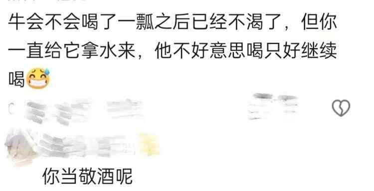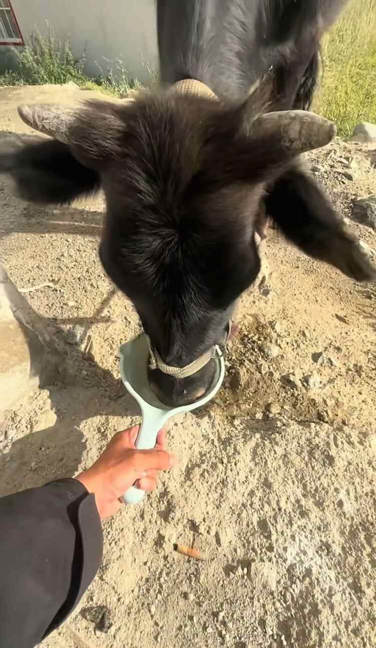 “正好去倒水,它(牛)跑到这边舔草,我想它应该渴了,就拿瓢喂它,发现它一口喝完了,再换一瓢又喝完了,索性换桶喂,网友们觉得很有趣。”