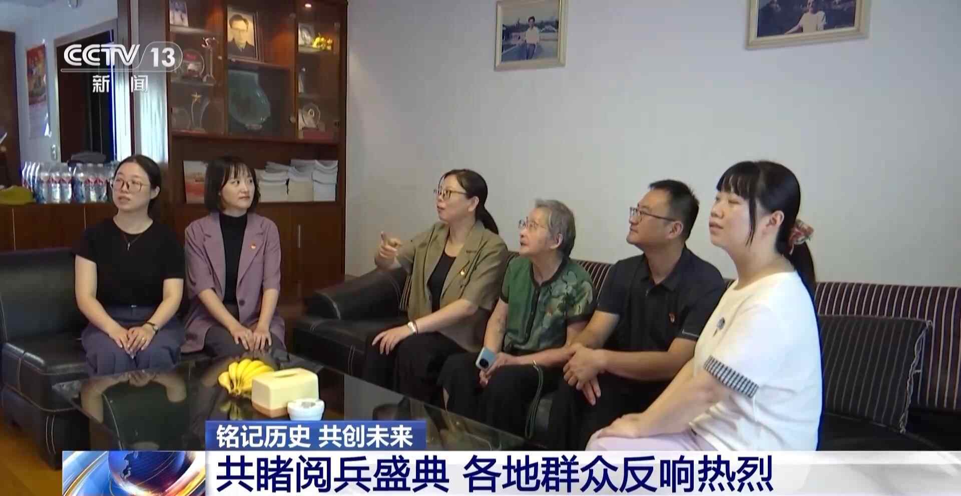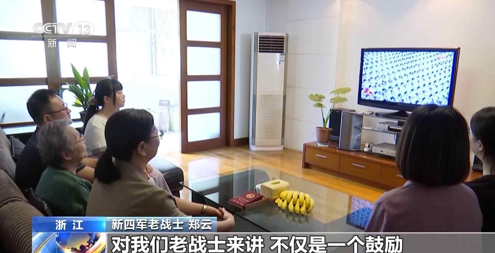 在浙江湖州93岁新四军老战士郑云的家中,社区工作人员与郑云老人一起收看大会直播,郑云曾先后参加过抗日战争、解放战争,看完此次阅兵,她感触颇深。