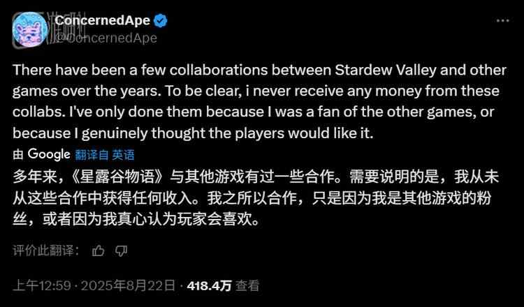 在联动公开后,ConcernedApe还专门发布了一条推文,表示自己没有在联动中收取任何费用,之所以会和其他作品合作,原因只有两个:要么因为自己是某款游戏的粉丝,要么就是因为他“真心认为玩家会喜欢这样的联动”。