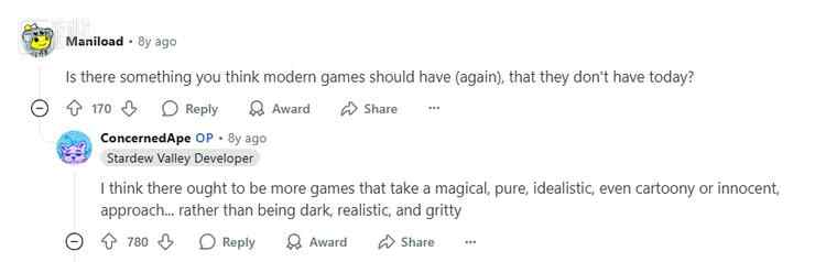 近十年前,一位玩家曾在Reddit上向《星露谷物语》的作者提问:“你觉得现代游戏里应该重新拥有、但现在缺少的东西是什么?”,而游戏作者ConcernedApe,亲自向TA留下了上述这段文字。