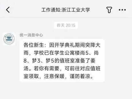 记者联系上了一名参与典礼的新生,他说,刚下雨的时候其实有老师给校长递雨衣,但是校长拒绝了,后来雨越来越大,就有2名参加典礼的新生上台给校长撑伞,造就了“双一流”的画面。他补充道,这次典礼学校给每个学生都准备了一次性雨衣和姜茶。