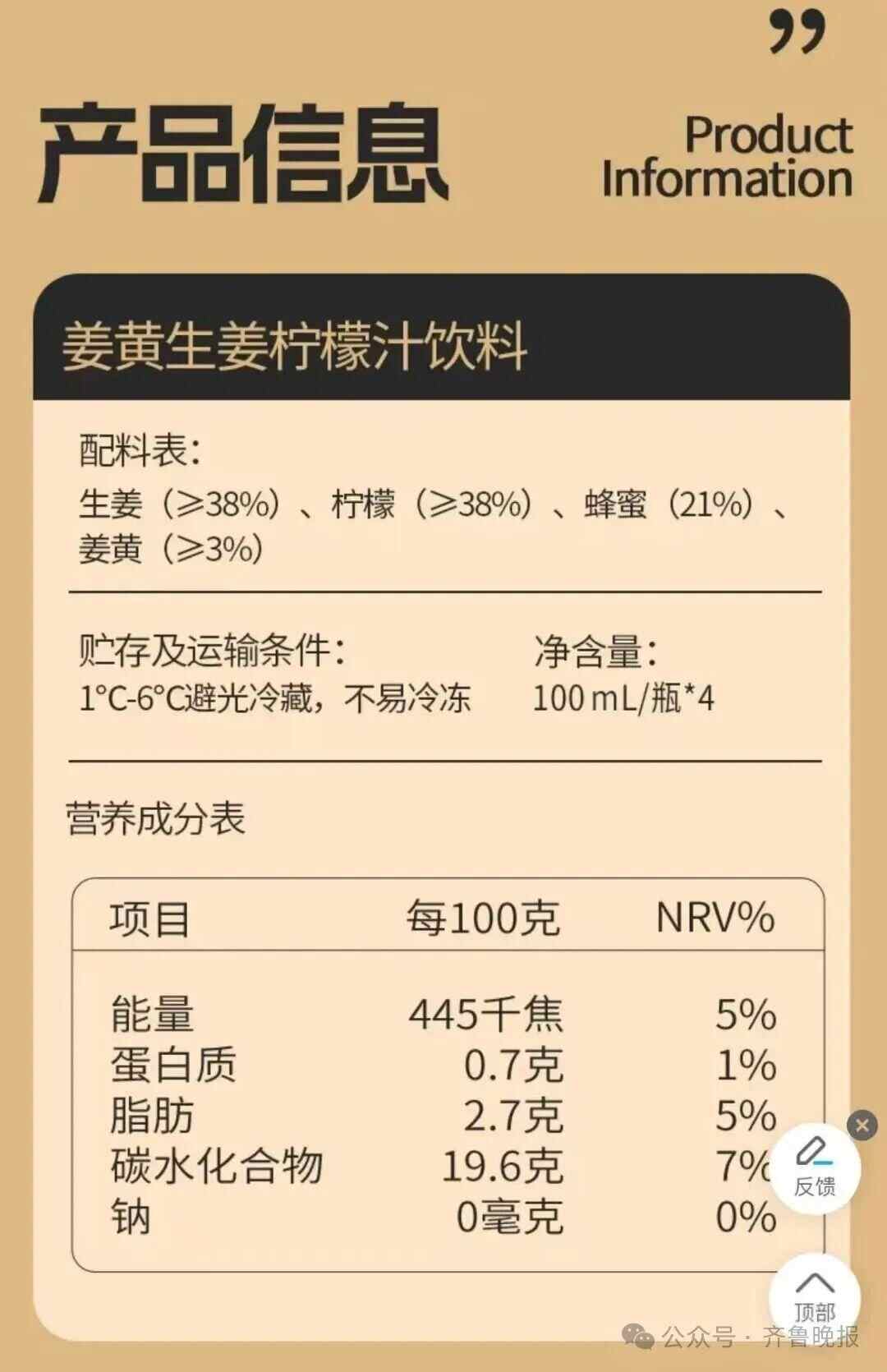 产品信息表显示,这款100ml的姜黄shot瓶含生姜(≥38%)、柠檬(≥38%)、蜂蜜(21%)、姜黄(≥3%)。