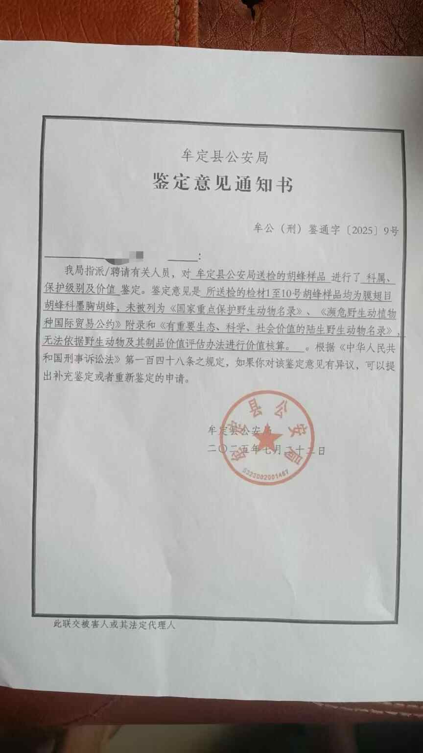 牟定县公安局7月22日作出的鉴定意见通知书显示,所送检的检材1至10号胡蜂样品均为膜翅目胡蜂科墨胸胡峰,未被列为《国家重点保护野生动物名录》、《濒危野生动植物种国际贸易公约》附录和《有重要生态、科学、社会价值的陆生野生动物名录》无法依据野生动物及其制品价值评估办法进行价值核算。