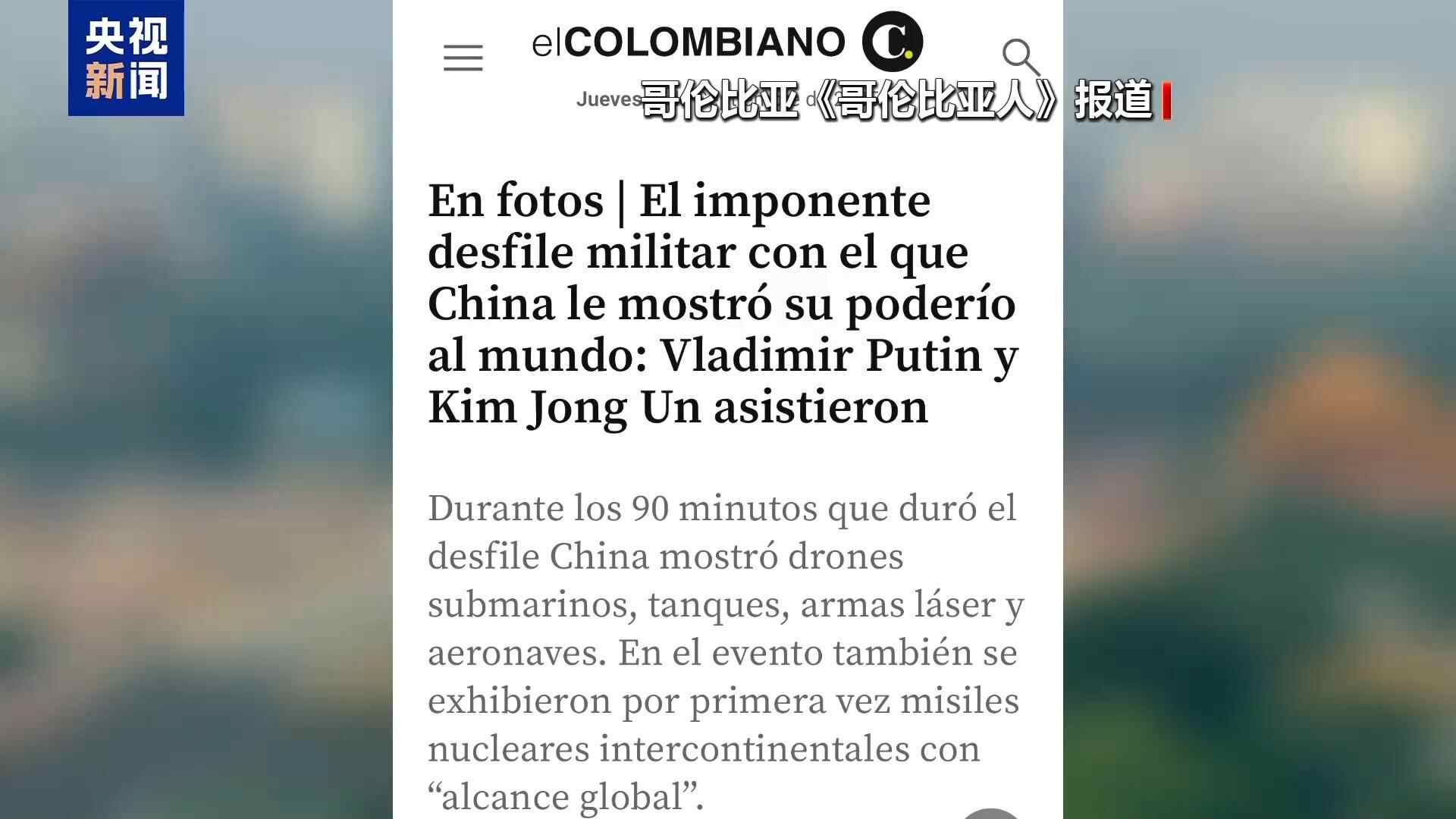 哥伦比亚西班牙语综合性日报《哥伦比亚人》报道说,中国展示了水下无人装备、新型坦克、激光武器和各类战机等。