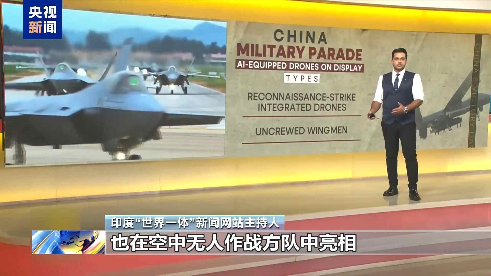 印度“世界一体”新闻网站主持人:新型人工智能技术无人机,也在空中无人作战方队中亮相,包括察打一体无人机,无人僚机,舰载无人直升机等装备。