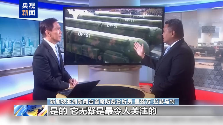 新加坡亚洲新闻台首席防务分析员 里兹万·拉赫马特:是的,它无疑是最令人关注的,因为社交媒体上此前彩排的画面中,它都没有出现过。我预计它的射程要比“东风-41”更长。