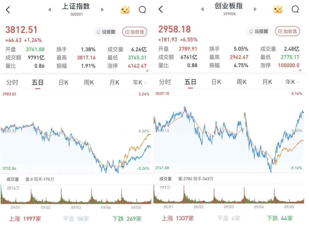 至收盘,上证综指涨1.24%,报3812.51点;科创50指数涨3.39%,报1268.55点;深证成指涨3.89%,报12590.56点;创业板指涨6.55%,报2958.18点。