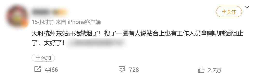 9月4日晚,“杭州东站禁烟”相关话题在社交网站上受到关注。有博主发帖称杭州东站开始禁烟,有工作人员在站台上用扩音器喊话阻止吸烟行为。