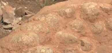 据工作人员介绍,这窝恐龙蛋化石埋藏状态原始,呈三层立体分布,蛋体最大直径达18厘米,初步判断是鸭嘴龙的恐龙蛋化石。