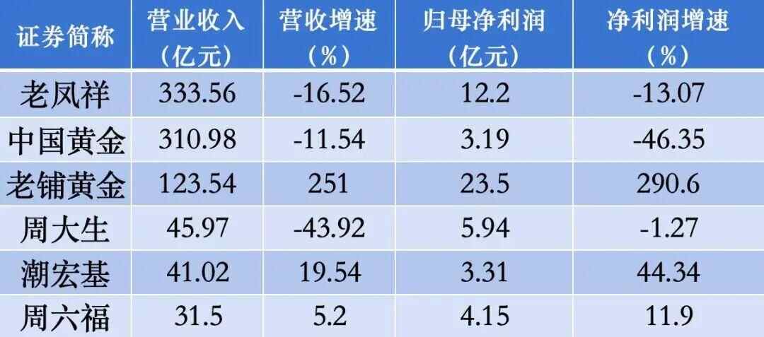 以老凤祥、中国黄金、老铺黄金、周大生、潮宏基、周六福等6家典型黄金珠宝上市公司为例,2025年上半年6家公司总营收886.57亿元,同比下滑近5%;总净利为52.29亿元,同比增长超37%。