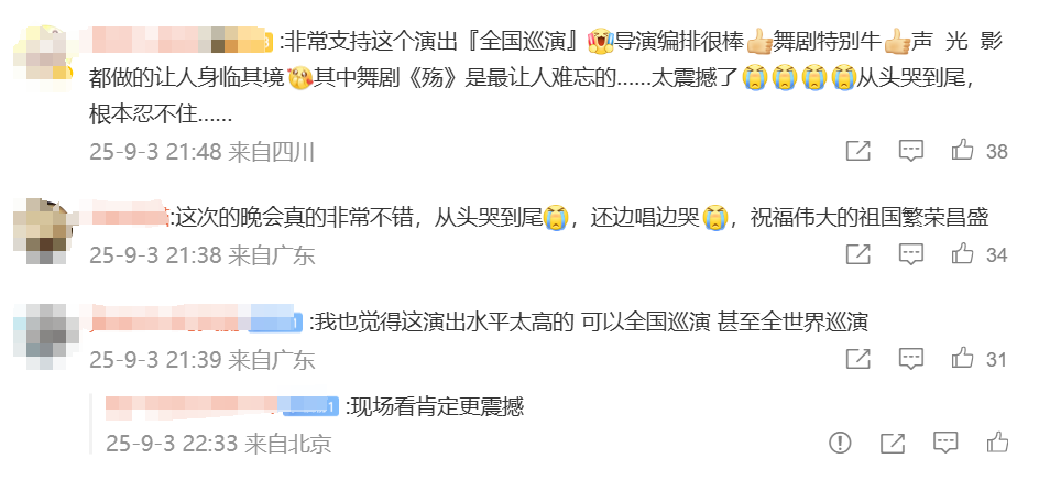 网友在观看过程中,纷纷留言评论,“阅兵看得我热血沸腾,晚会看得我泪流满面”“看得直起鸡皮疙瘩”“建议文艺晚会全国巡演”……
