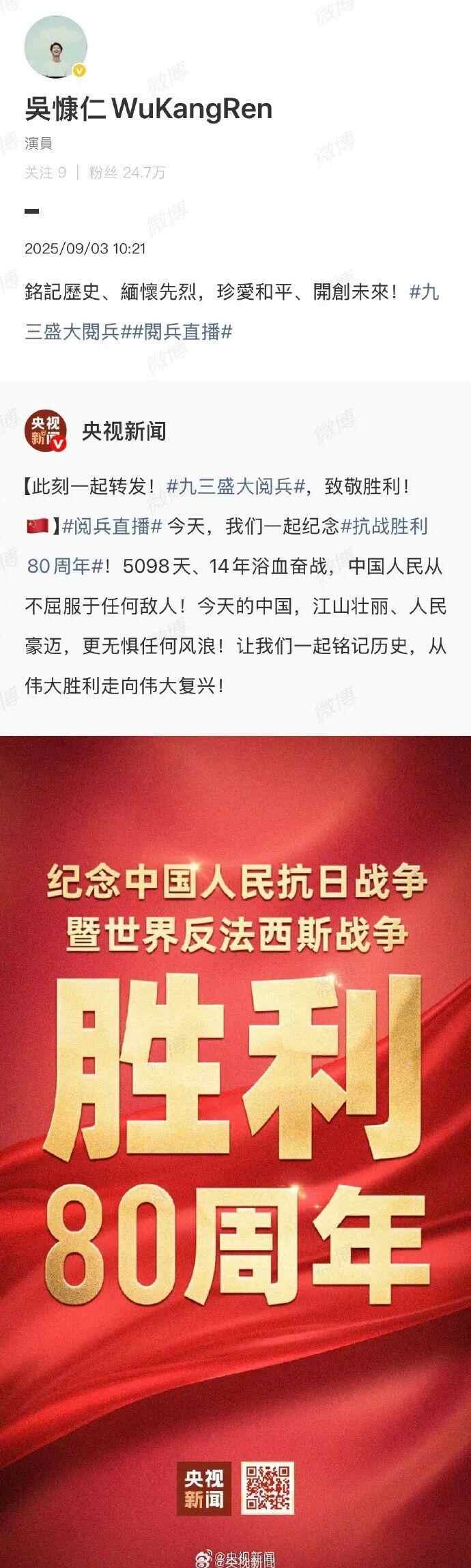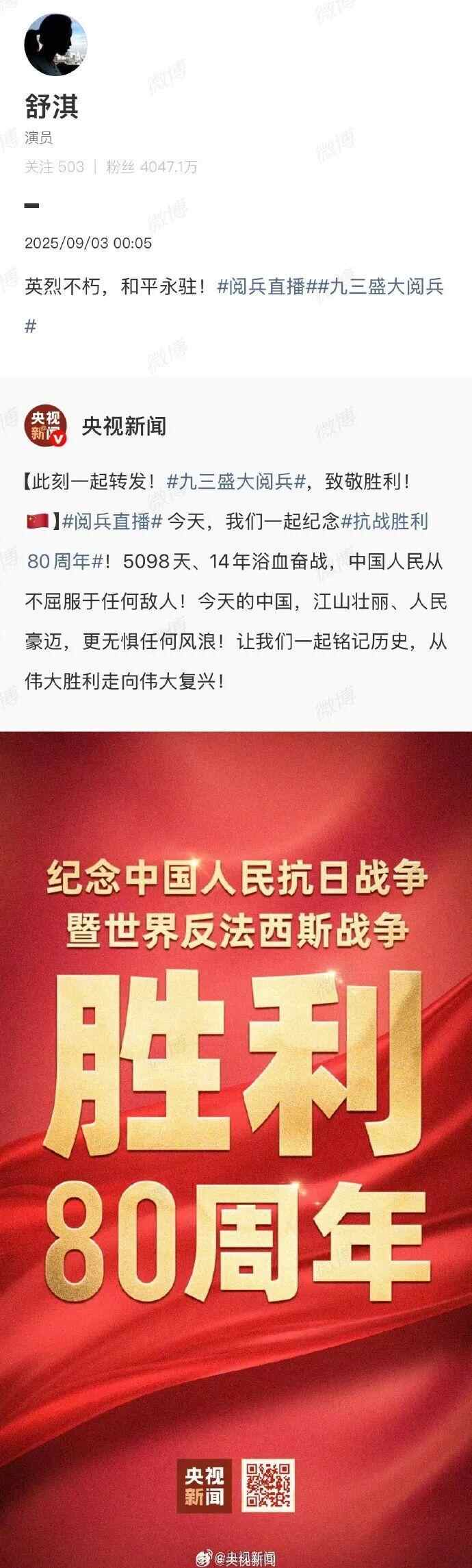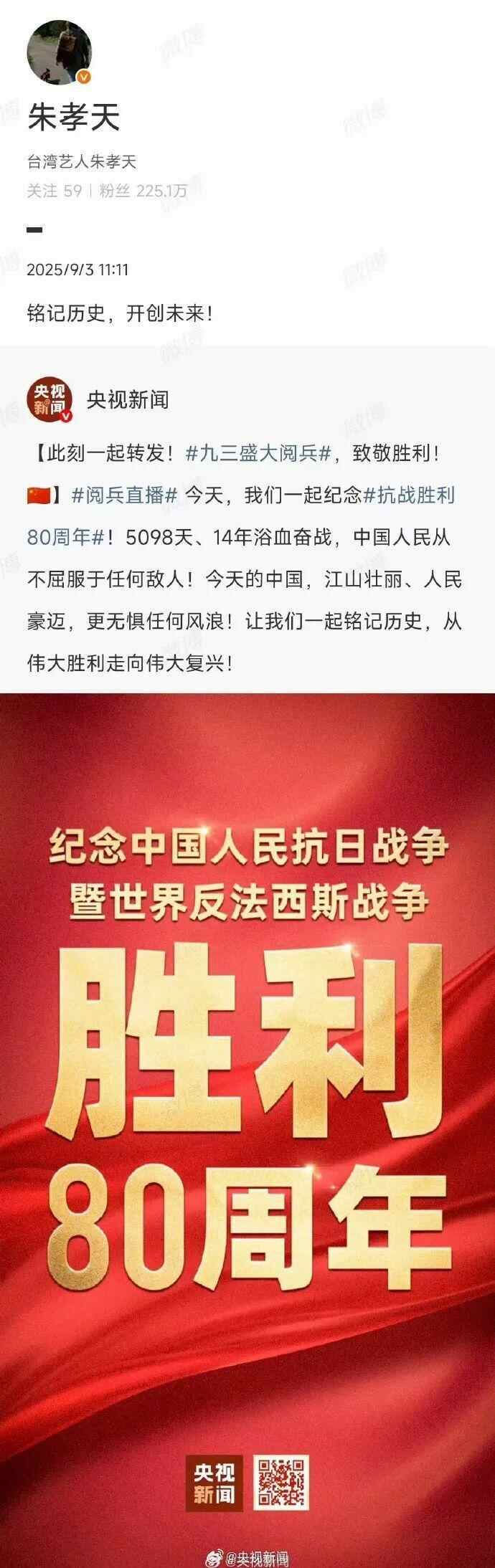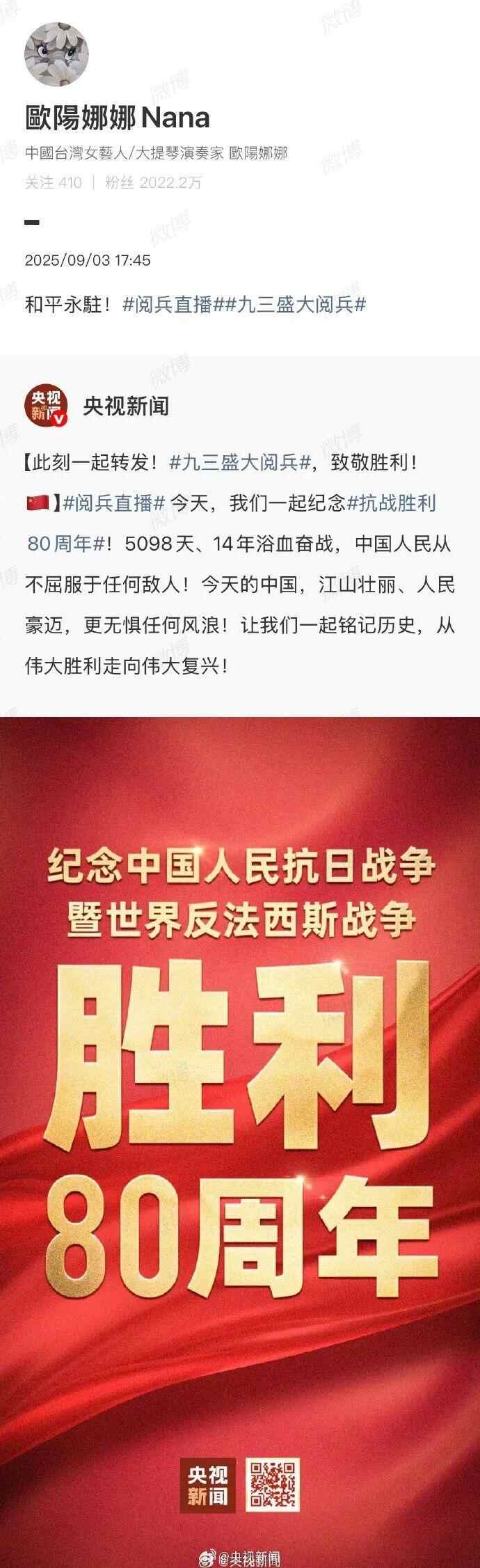 台湾艺人纷纷转发海报,庆祝胜利日、致敬英烈:“英雄不朽,和平永驻!”“愿万里山河永昌,祖国繁荣富强!”“台湾人一定要感受大陆的进步与繁荣。”