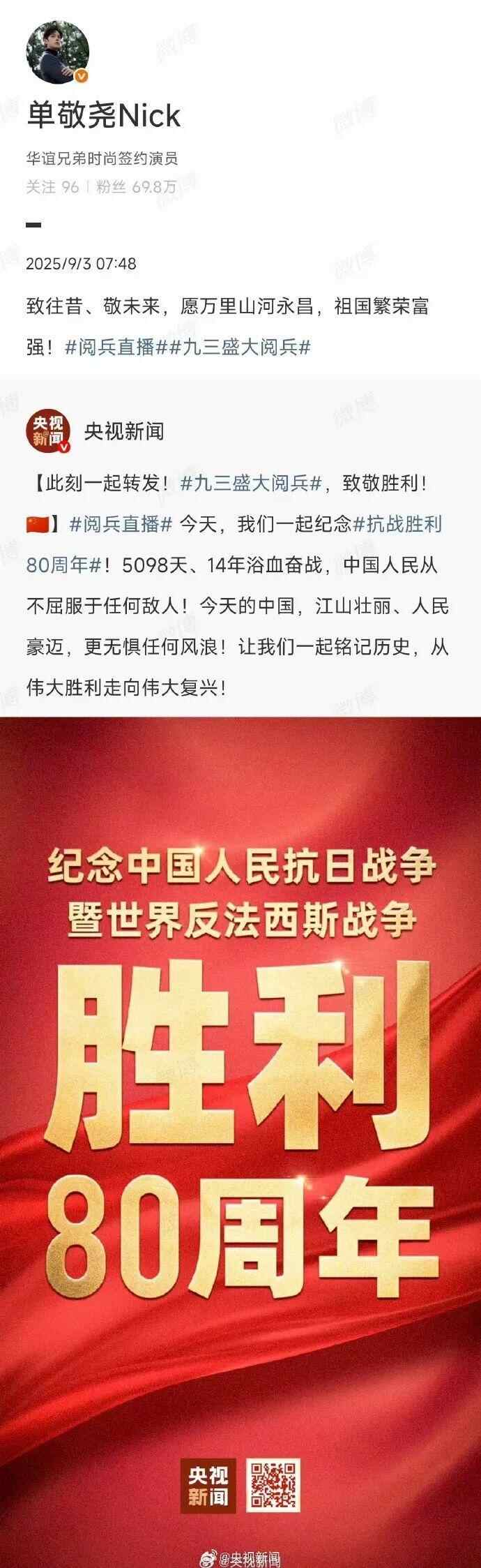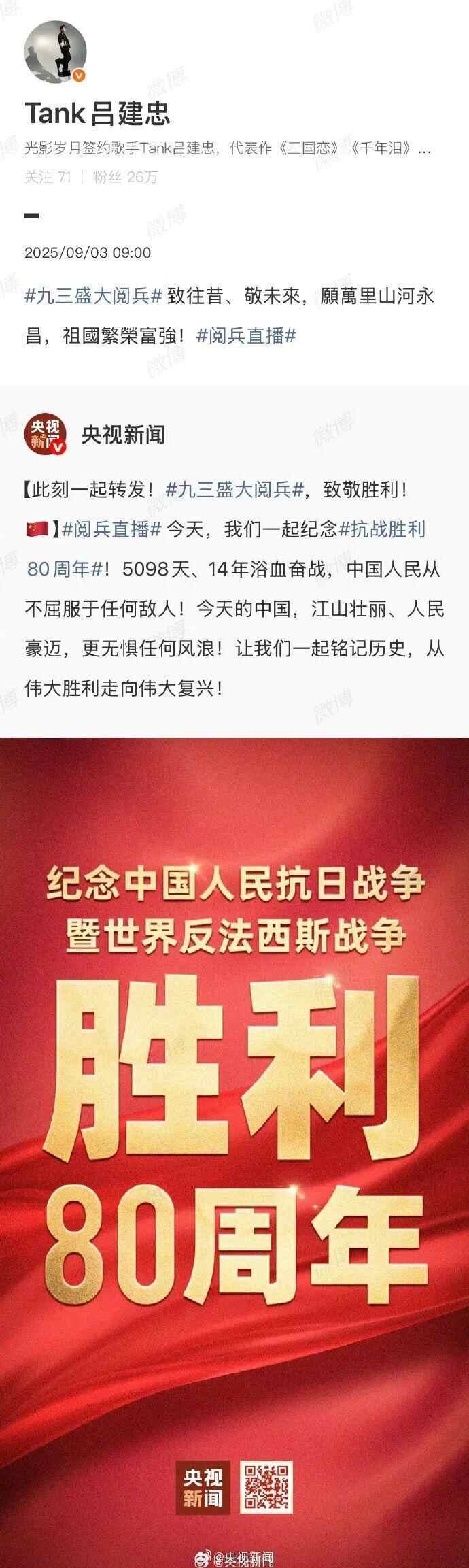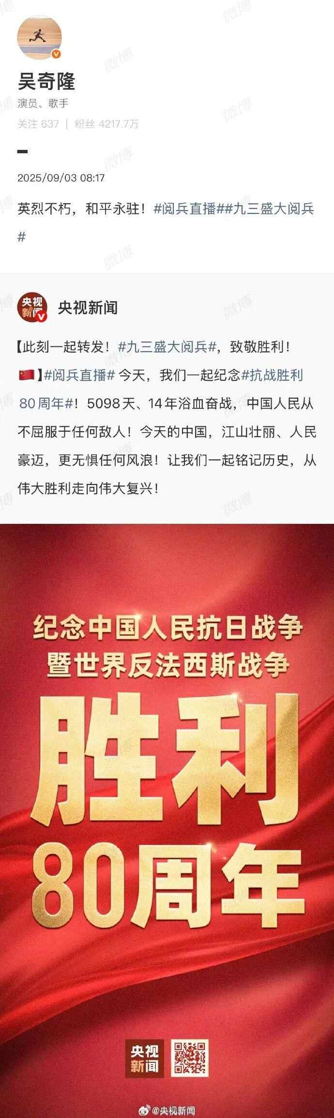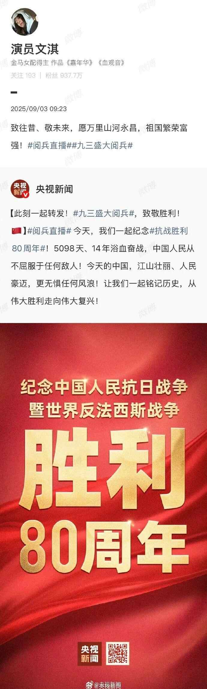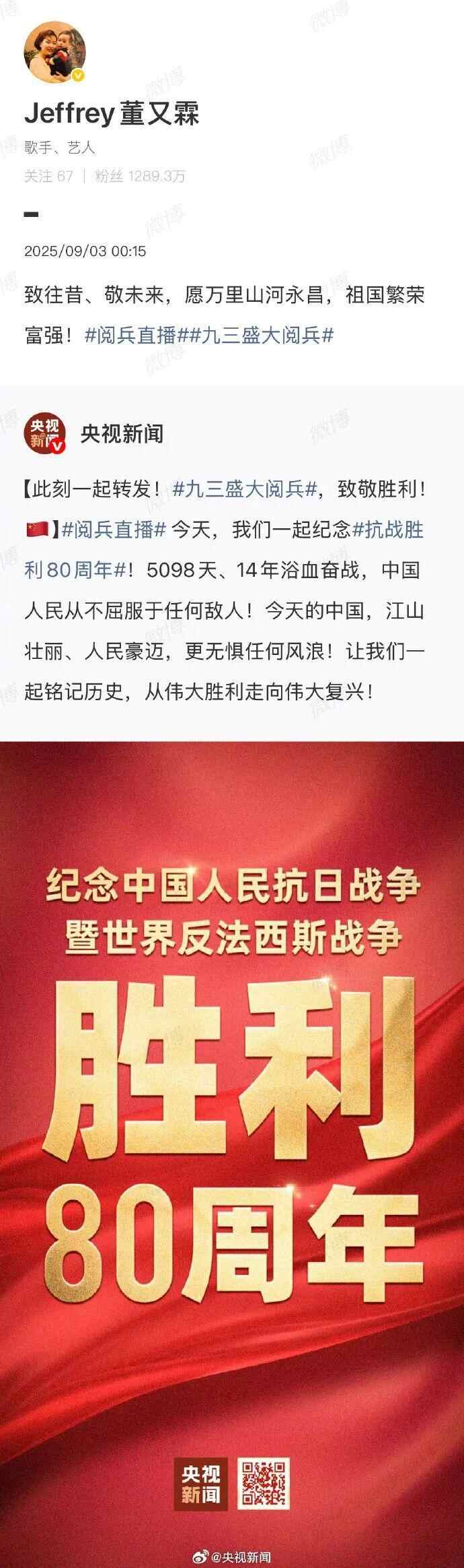 台湾艺人纷纷转发海报,庆祝胜利日、致敬英烈:“英雄不朽,和平永驻!”“愿万里山河永昌,祖国繁荣富强!”“台湾人一定要感受大陆的进步与繁荣。”
