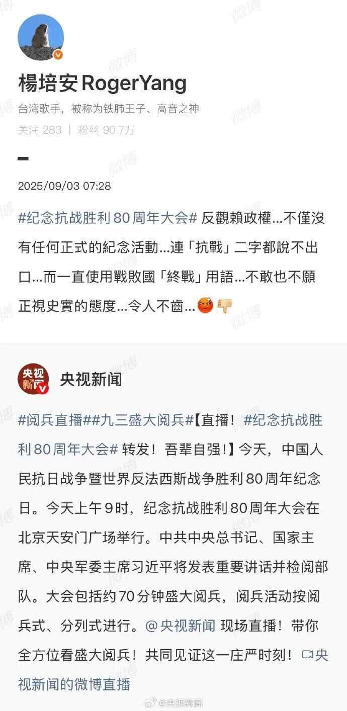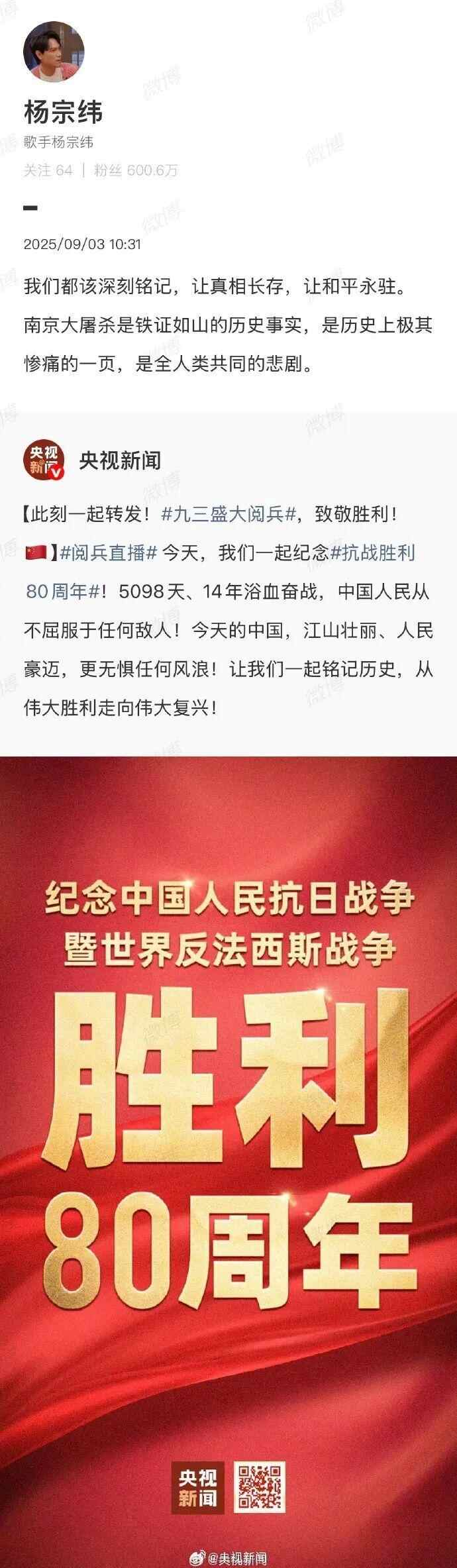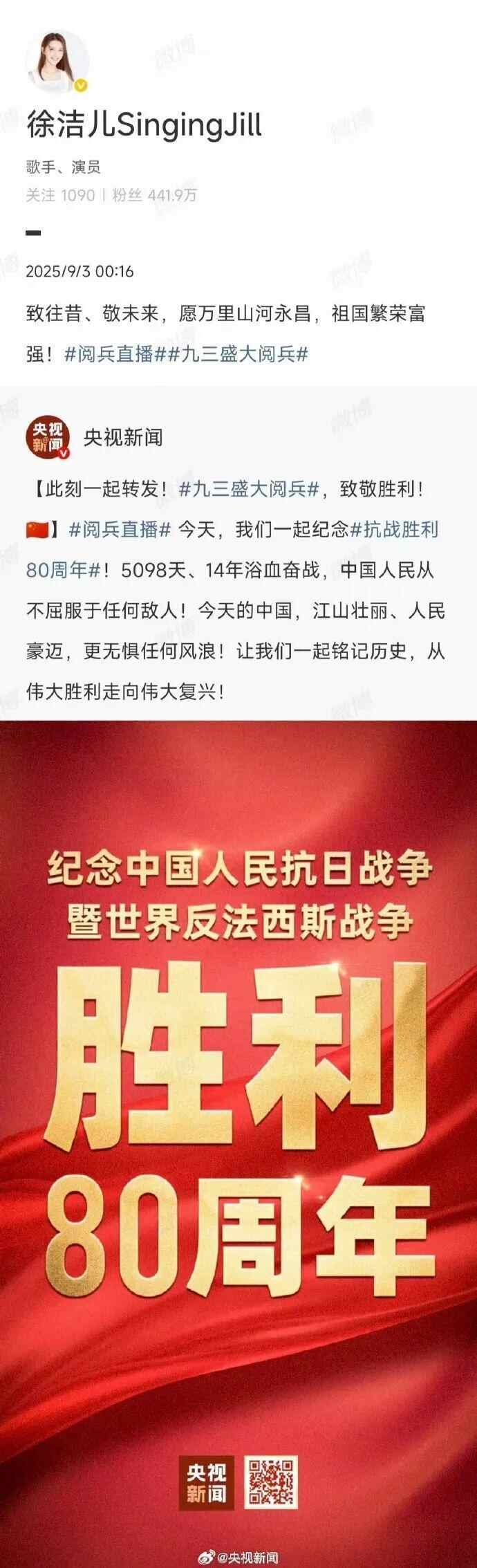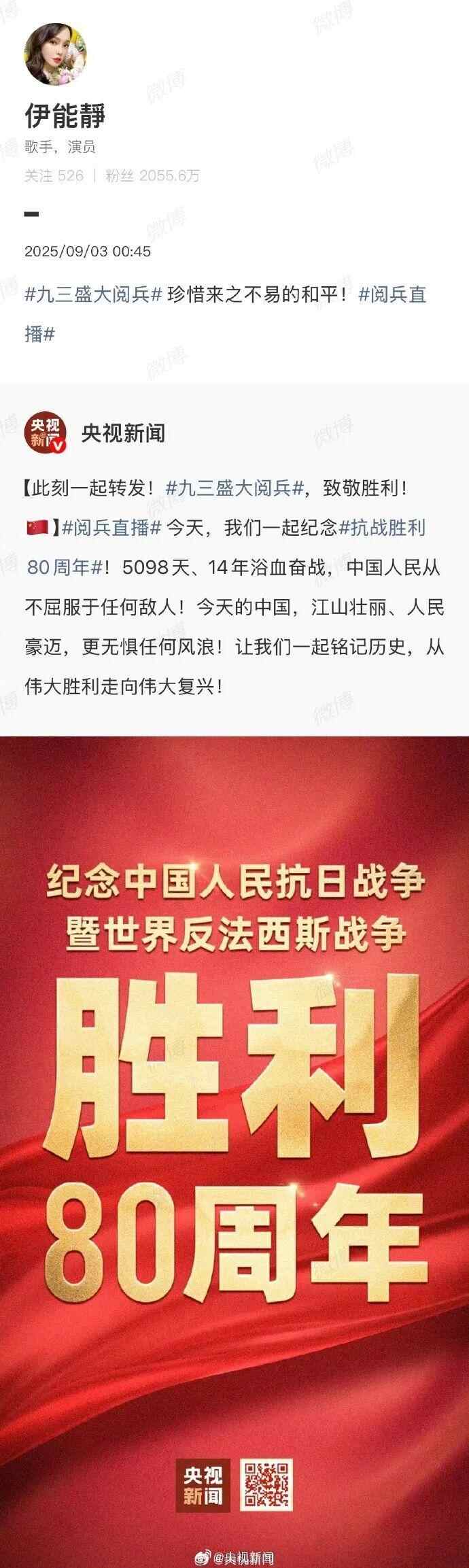 台湾艺人纷纷转发海报,庆祝胜利日、致敬英烈:“英雄不朽,和平永驻!”“愿万里山河永昌,祖国繁荣富强!”“台湾人一定要感受大陆的进步与繁荣。”