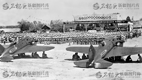 抗战期间,新疆民众踊跃捐款购买战斗机支援抗日前线。图为捐赠战斗机命名仪式现场。新疆图片库提供