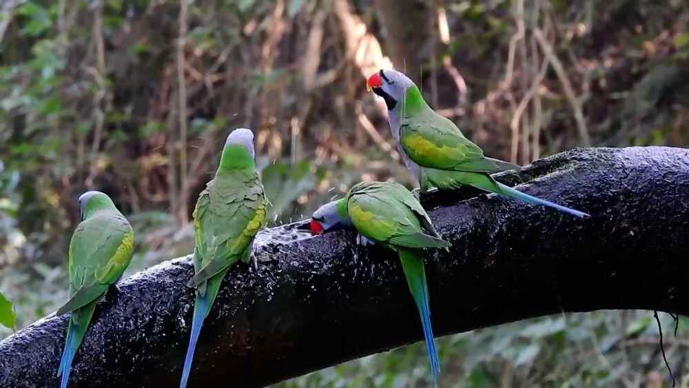 近日,在云南省普洱市思茅区思茅港镇茨竹林村芒坝村民小组,成群的国家二级保护动物大紫胸鹦鹉飞临村子周围的榕树嬉戏。