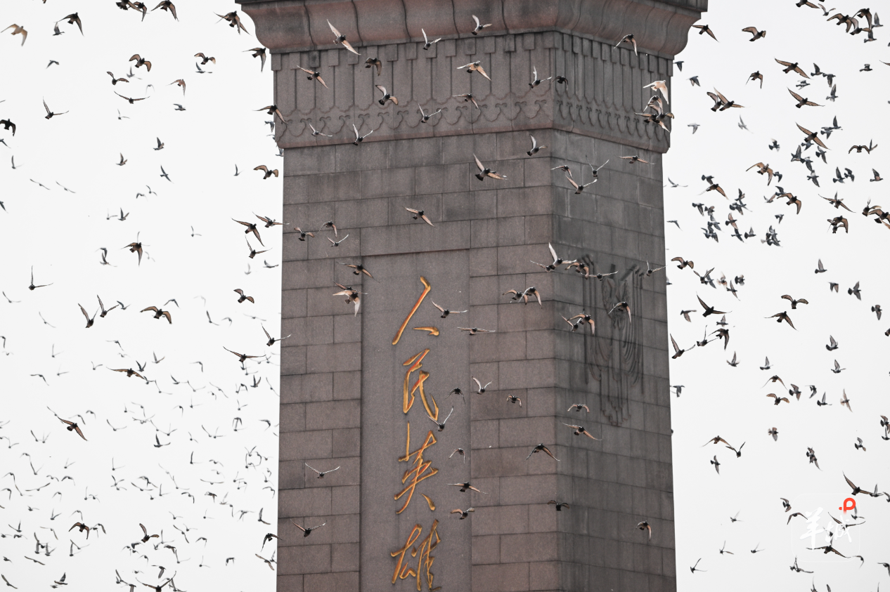 人民英雄纪念碑前搭建了“1945”“2025”两个年号台,是长城烽火台的造型,上面镶嵌着14只和平鸽。年号台两侧种满了菊花。远处的天安门广场灯火通明,所有的工作人员都在为大会作着最后的准备。
