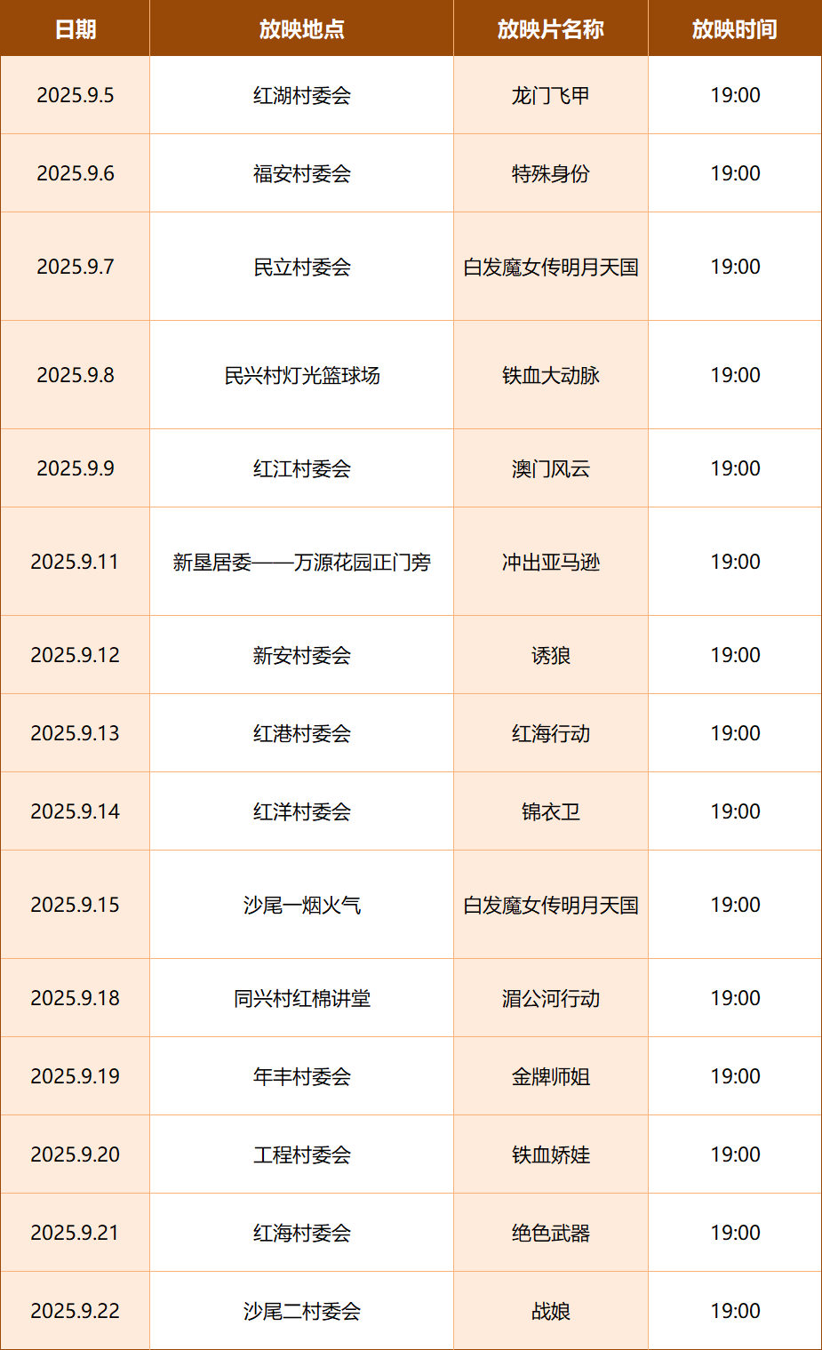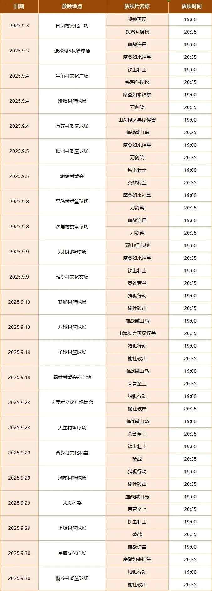 榄核镇9月数字电影放映安排表